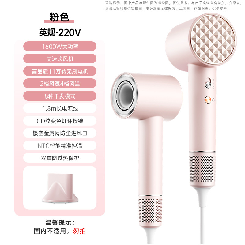 [Нейтральный британский стандарт] K1-Pink-1600W + высокоскоростной бесщеточный двигатель 110 000 об/мин + кнопочный индикатор температуры воздуха + магнитное воздушное сопло-220 В