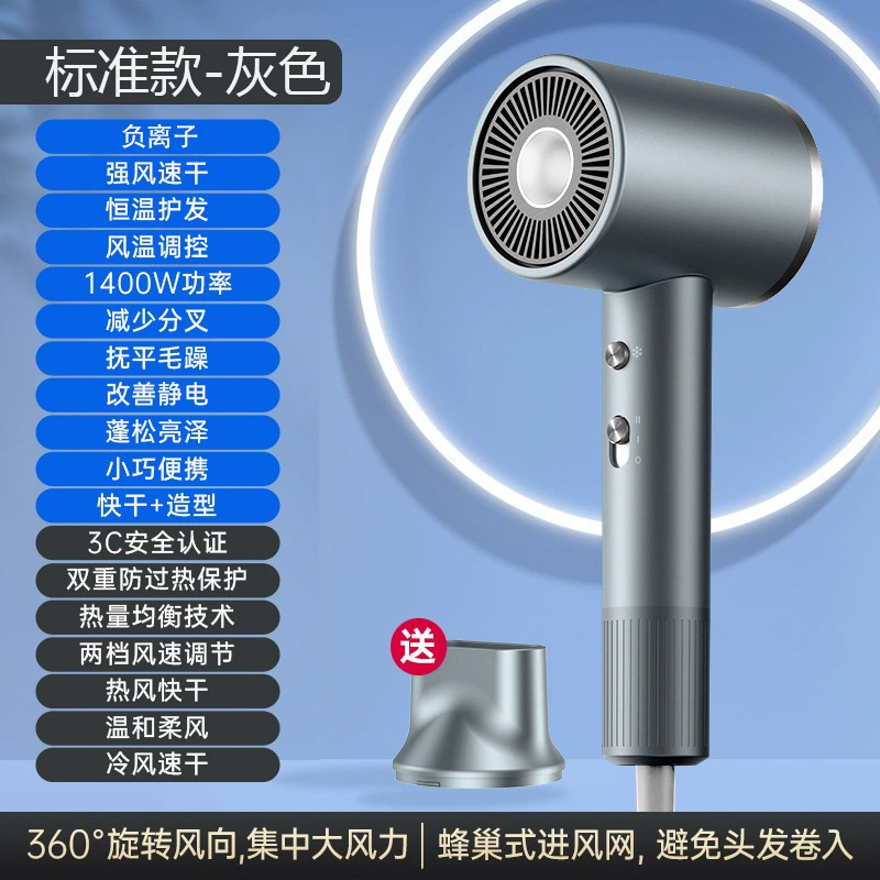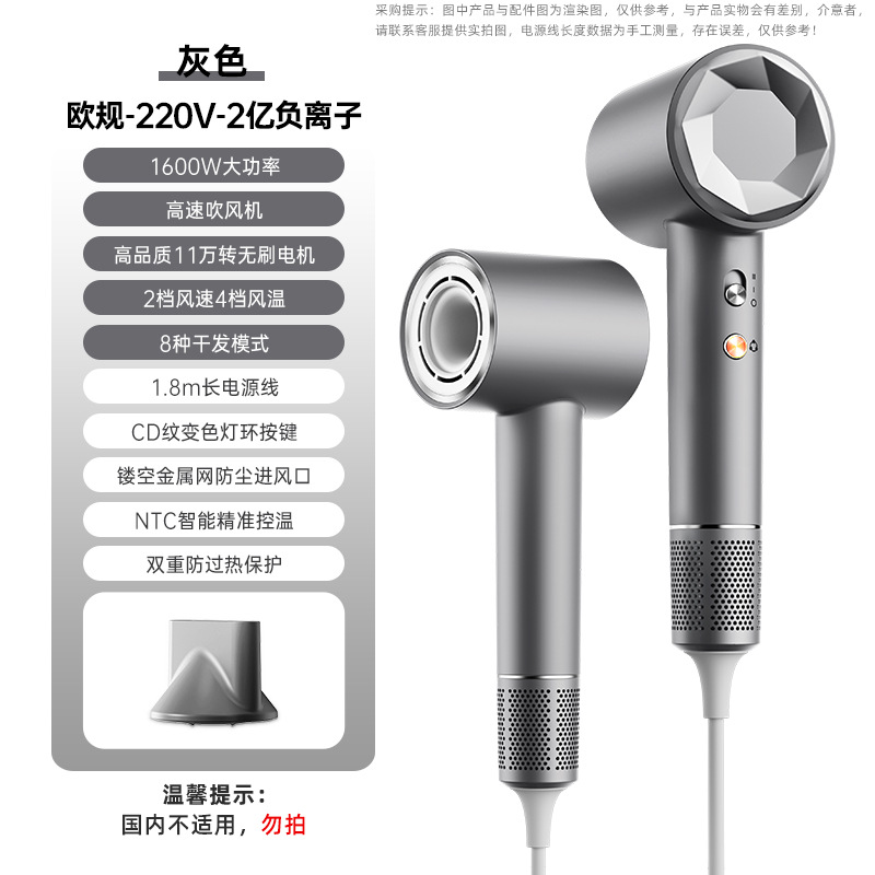 [Нейтральный европейский стандарт] D1-серый-отрицательные ионы+1400 Вт+высокоскоростной матовый двигатель 20 000 об/мин+воздушная насадка с пряжкой-220 В