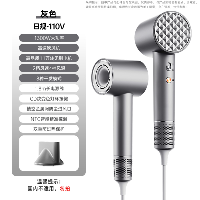 [Нейтральный японский стандарт] K2-Gray-1300W+Высокоскоростной бесщеточный двигатель 110 000 об/мин+Кнопочный индикатор температуры воздуха+Магнитное воздушное сопло-110 В
