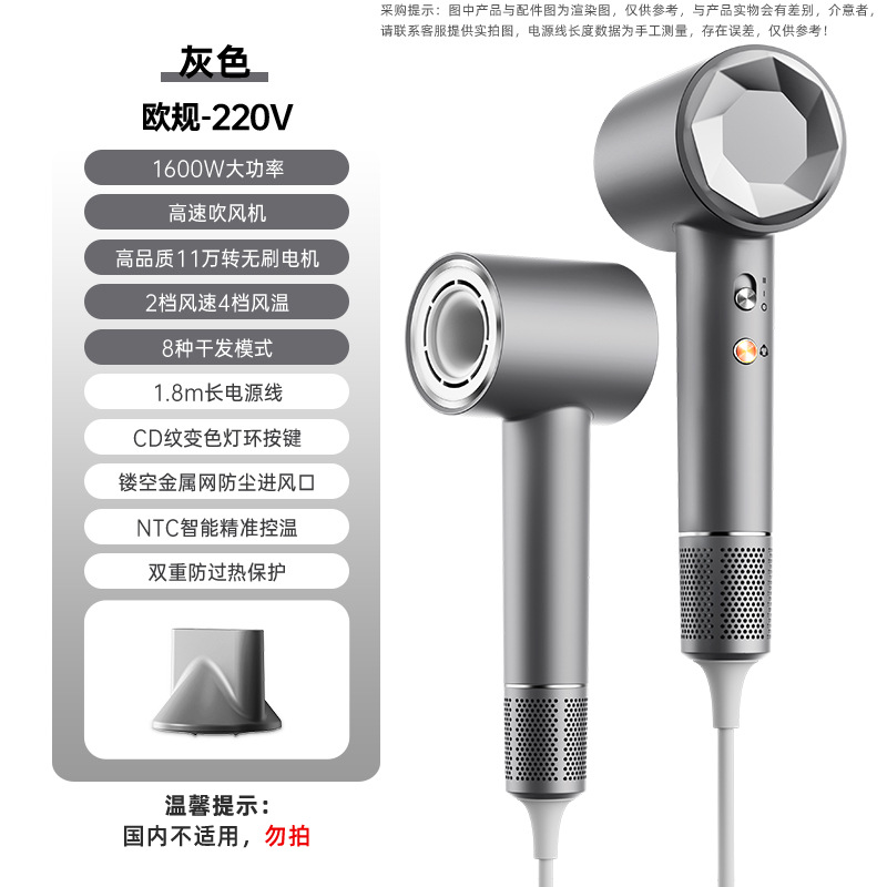 [Нейтральный европейский стандарт] K2-grey-1600W + высокоскоростной бесщеточный двигатель 110 000 об/мин + кнопочный индикатор температуры воздуха + магнитное воздушное сопло-220 В