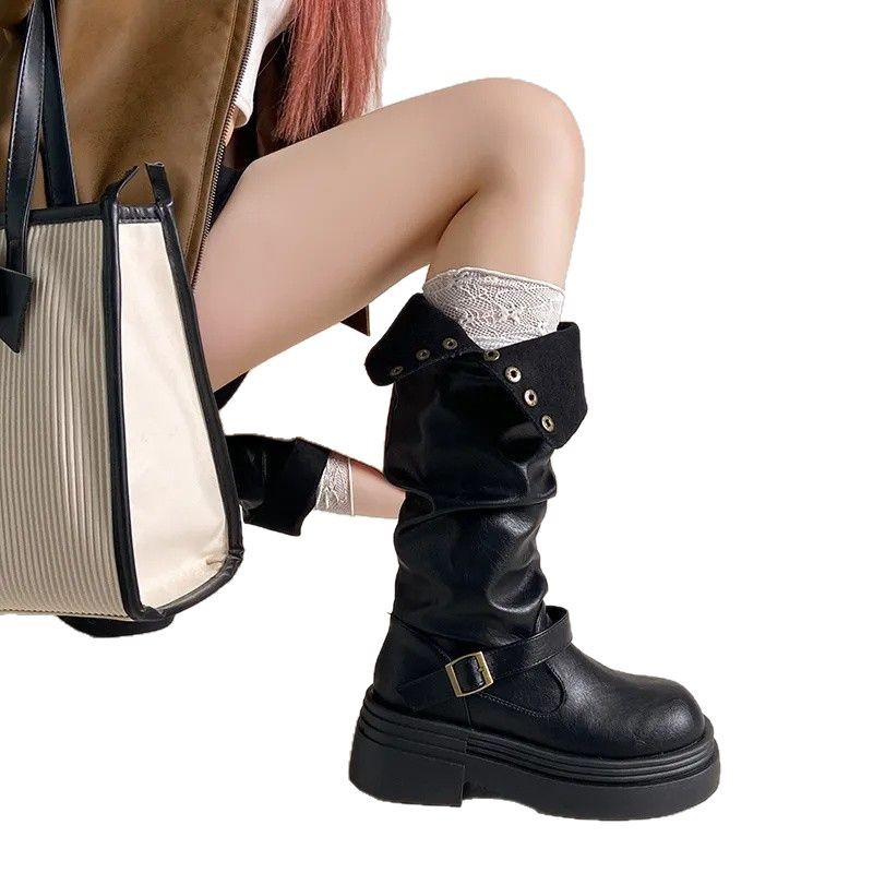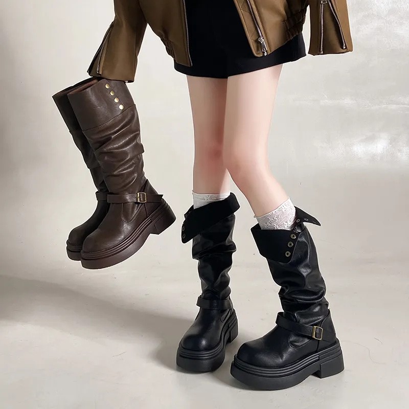 Гонконг Millard длинная труба, сложенные сапоги, женщины 2024 осень и зима новая толстая подошва, увеличенные уличные модные сапоги