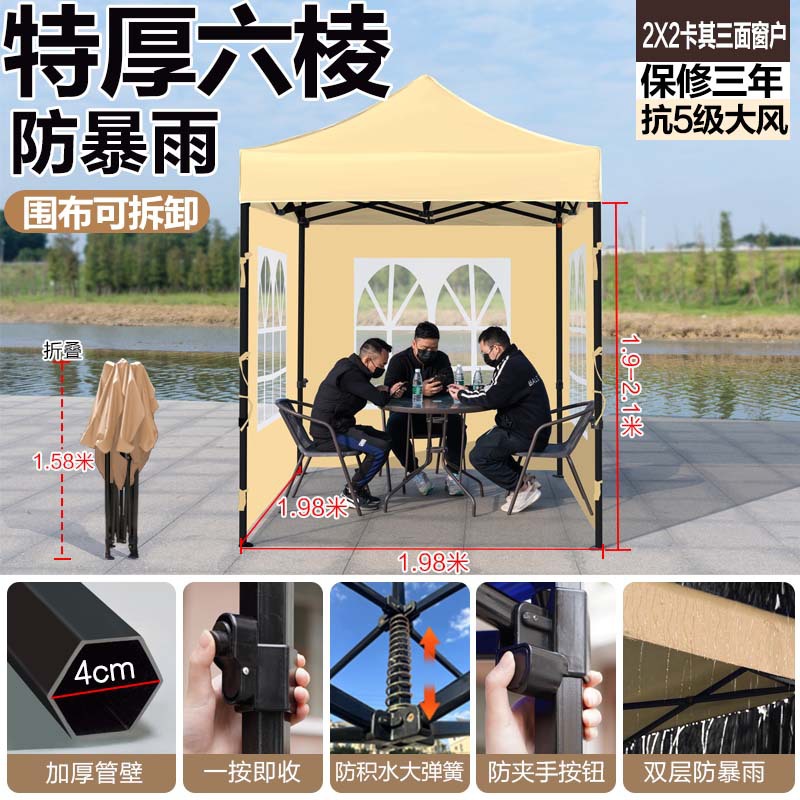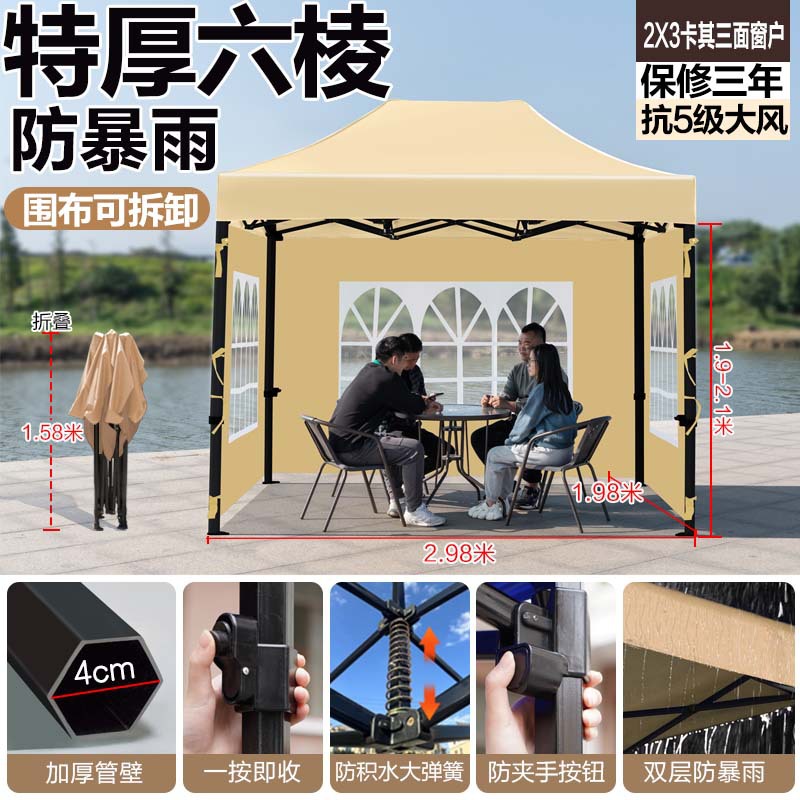 Экстра-плотная и утолщённая чёрная шестиугольная модель окна 2x3+3 с тканевыми боковыми стенками, цвет хаки [водонепроницаемая и устойчивая к сильным порывам ветра + теплоизоляция, съёмная + доступна в нескольких цветах].