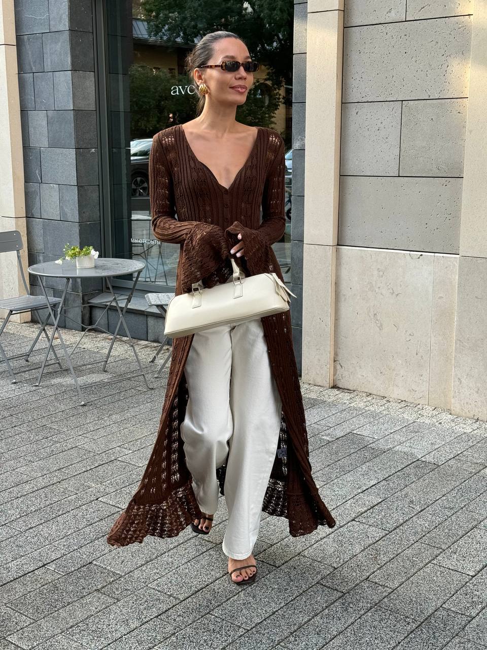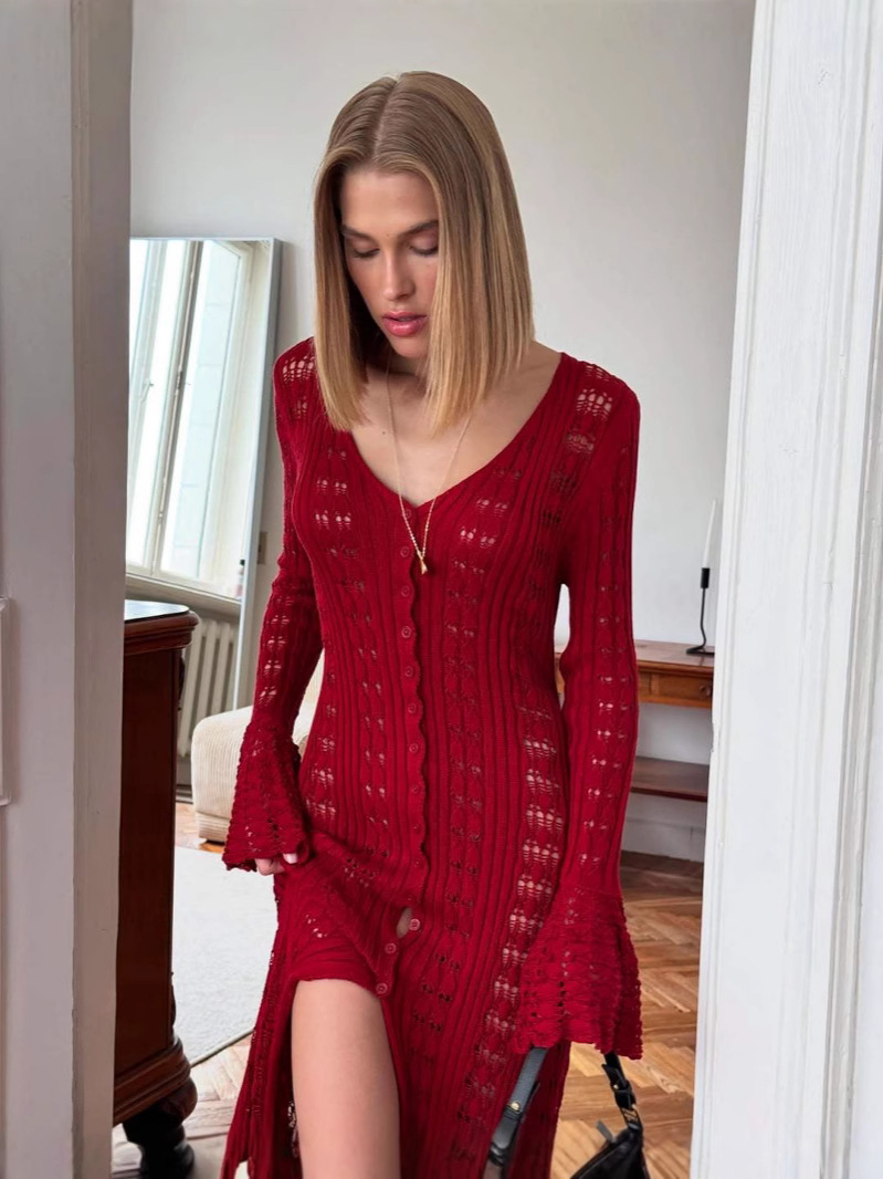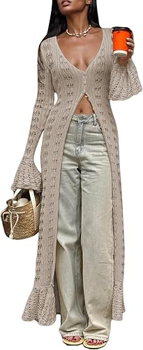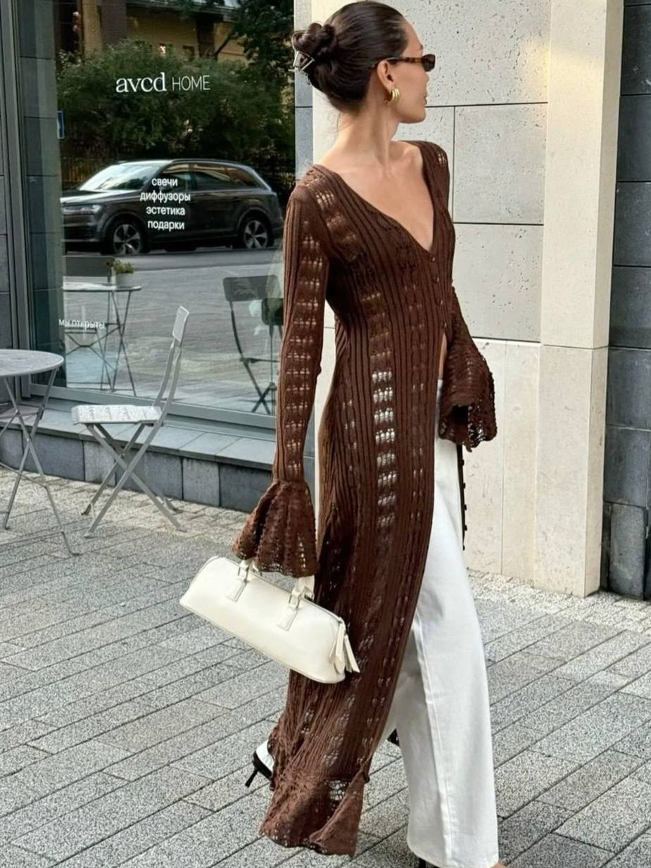 Главная страница > Длинный вязаный жакет для женщин в европейском и американском стиле с рюшами и длинным кардиганом в форме колокольчика.