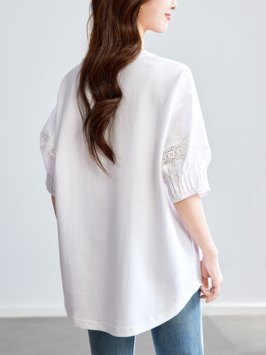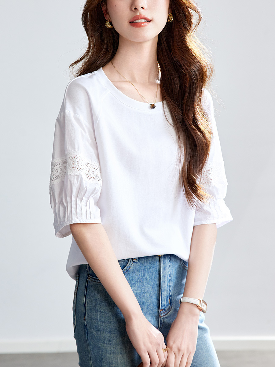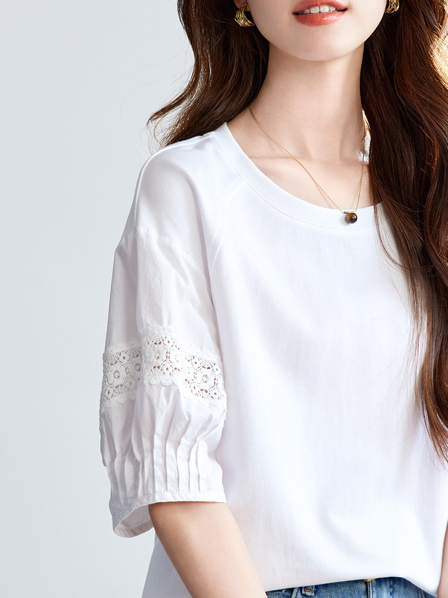 Главная страница > [На заказ] белая футболка женская с коротким рукавом, летняя новинка 2025 года, кружевной топ с вырезом и рукавами-фонариками