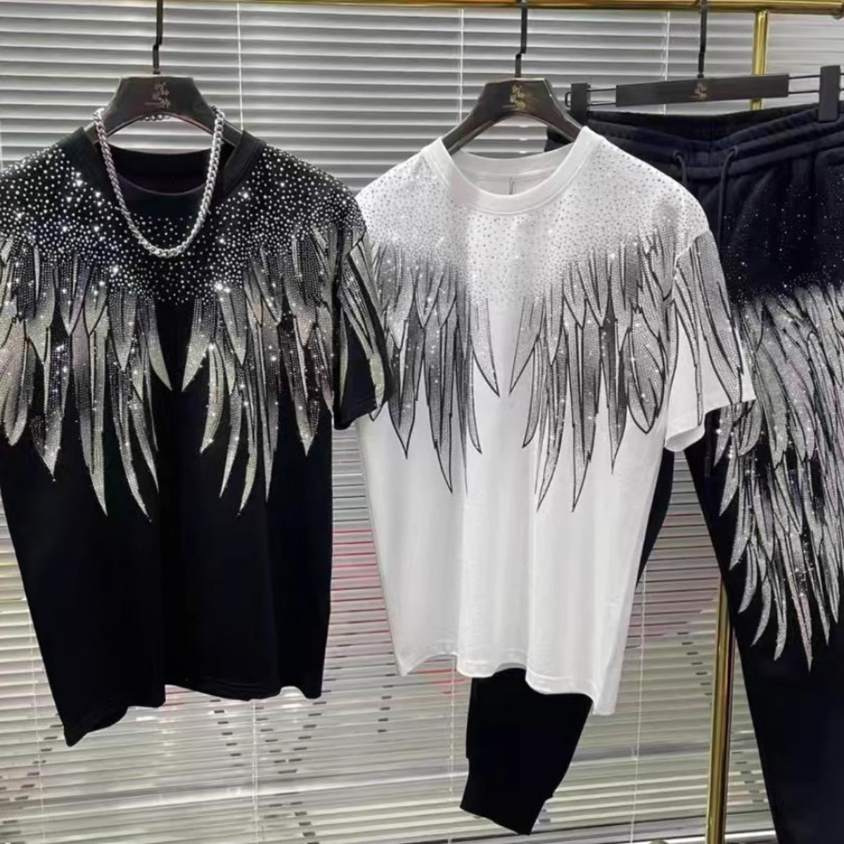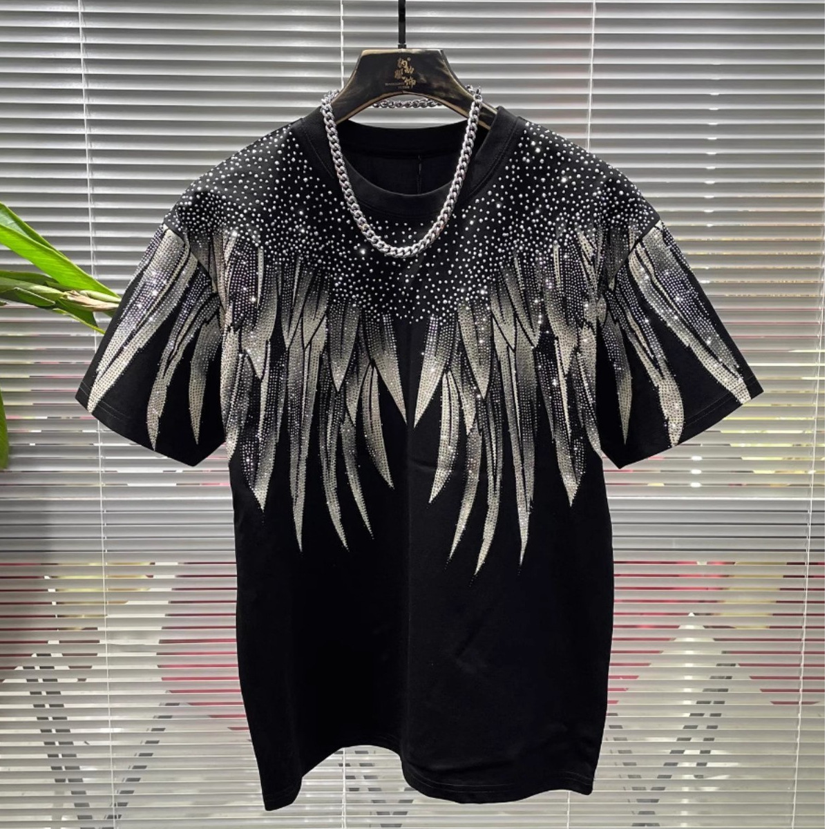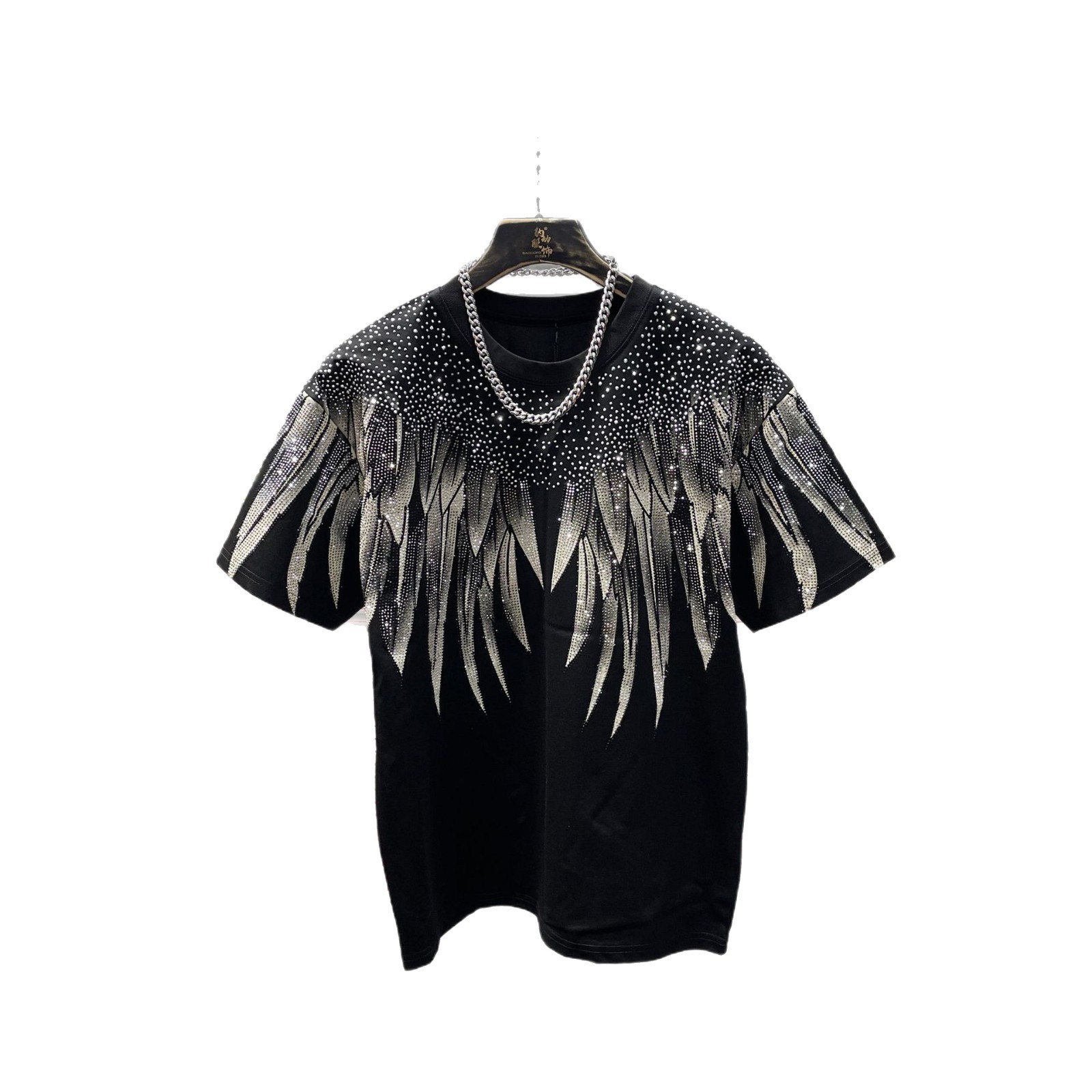 Главная страница > Плюс размер 1.0-150kg мм, модная брендовая футболка из чистого хлопка с черными крыльями и горячими бриллиантами, женские свободные топы с короткими рукавами и круглым вырезом для мужчин и женщин