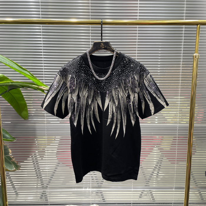 Плюс размер 1.0-150kg мм, модная брендовая футболка из чистого хлопка с черными крыльями и горячими бриллиантами, женские свободные топы с короткими рукавами и круглым вырезом для мужчин и женщин