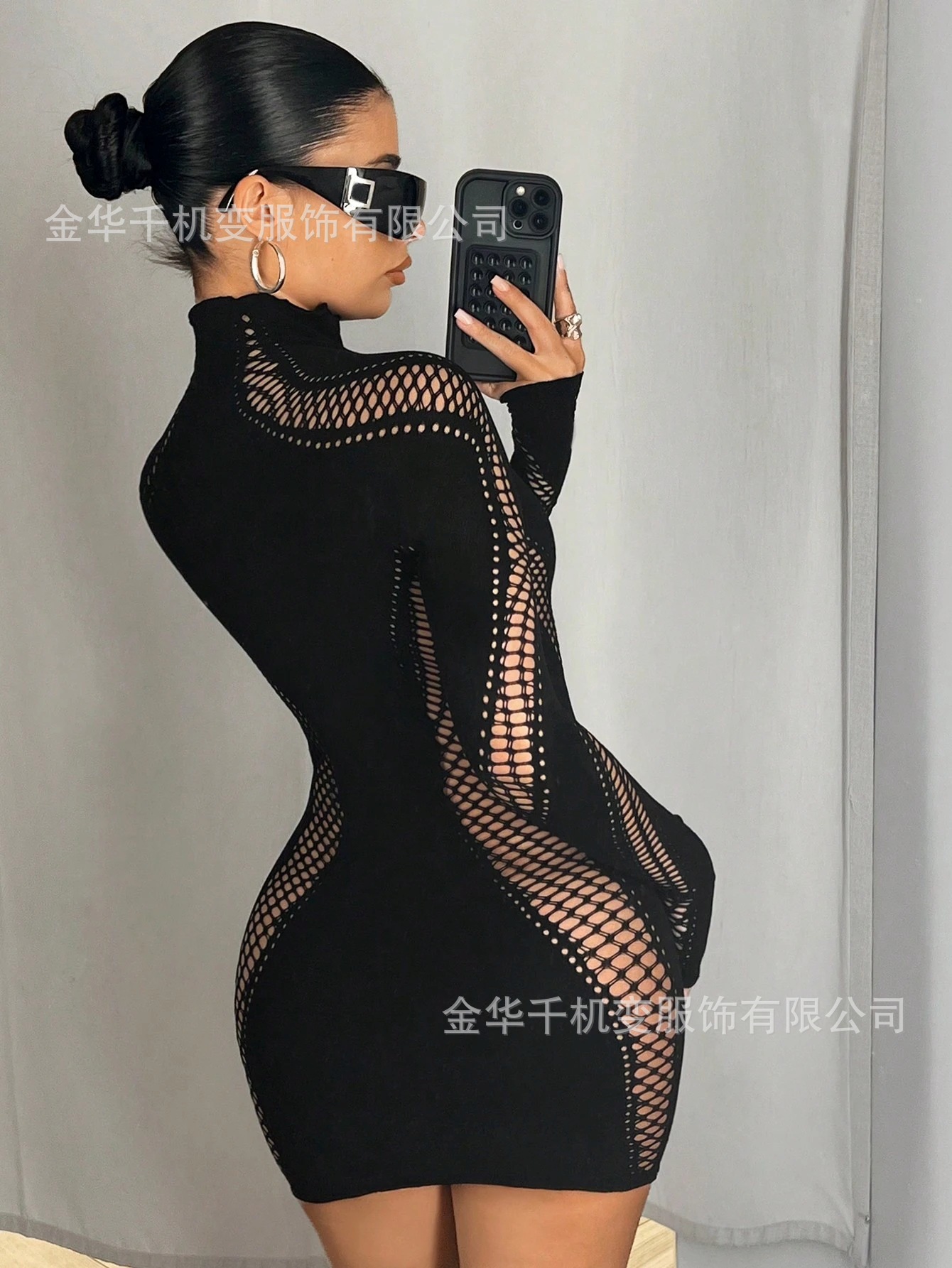 Главная страница > Оптовая продажа: Новое женское трикотажное платье из нейлона с длинным рукавом, полувысоким воротником, вырезами и стразами, осень 2025