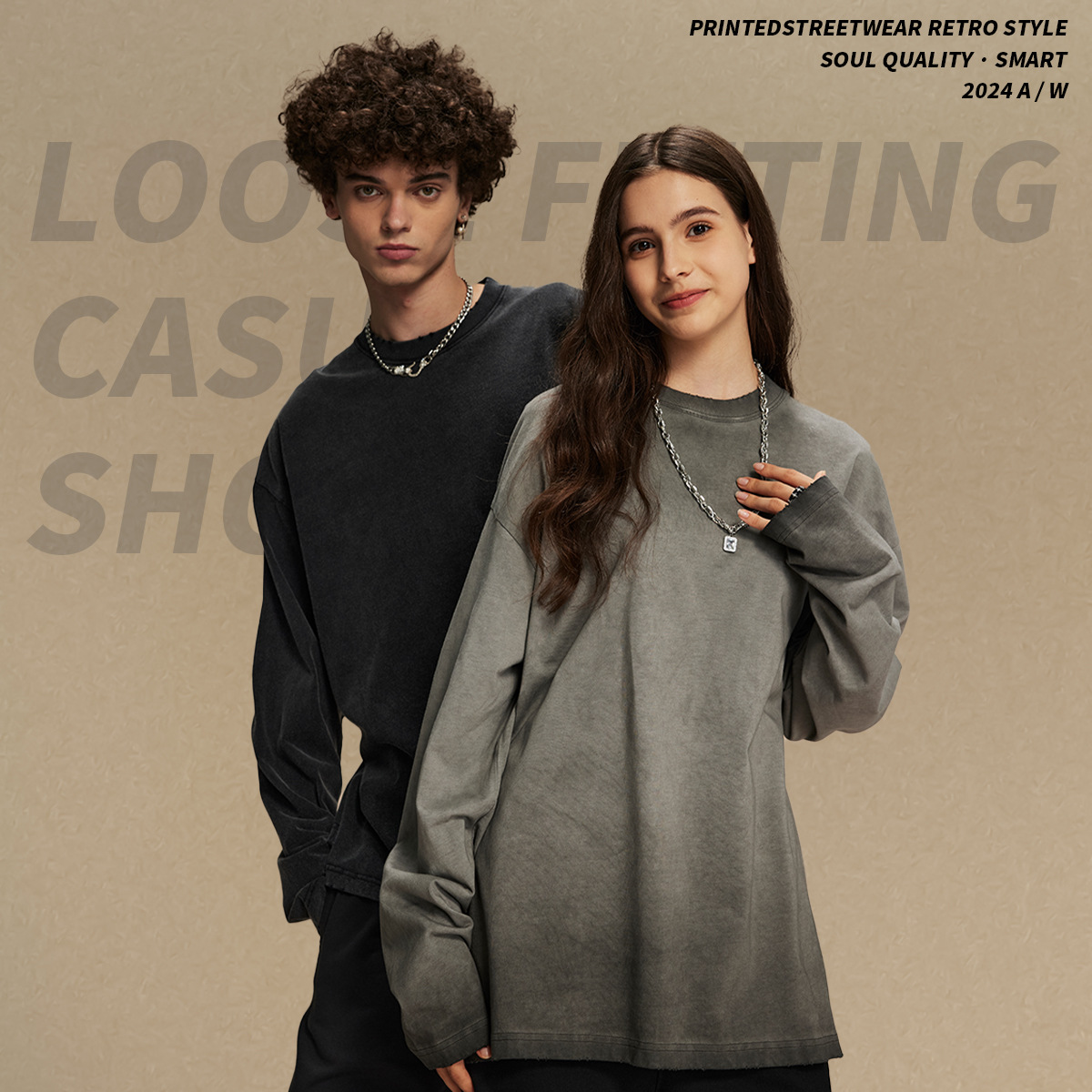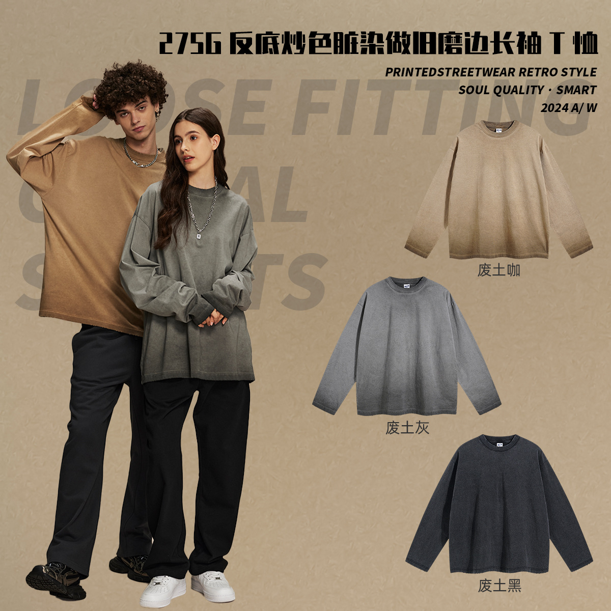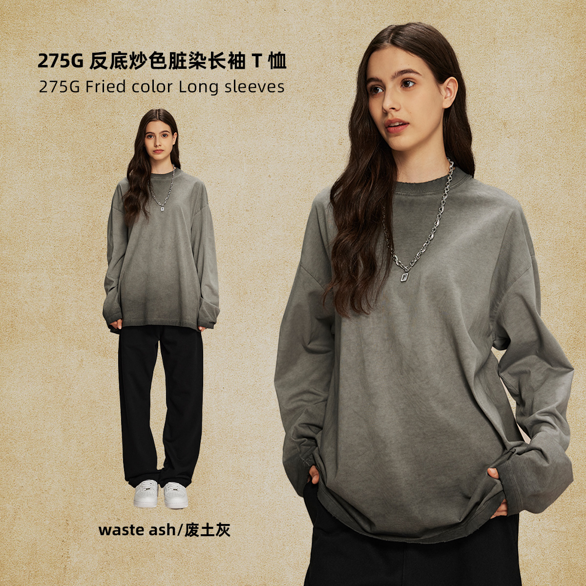 Осень 2024, мужская футболка с длинными рукавами в стиле грязной окрашеннойeland, с длинными рукавами в стиле ретро, жареный цвет, уличная модная брендовая футболка, мужская толстовка