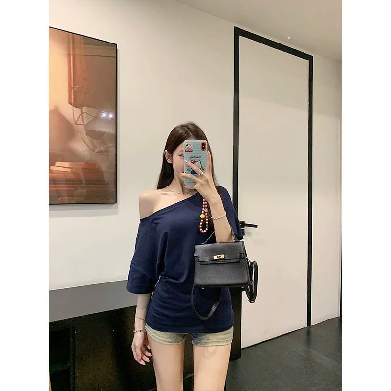 Женская футболка с открытыми плечами, короткий рукав, новый стиль лета 2025, свободная и облегающая, закрывающая тело, на одно плечо, модный топ контрастных цветов.