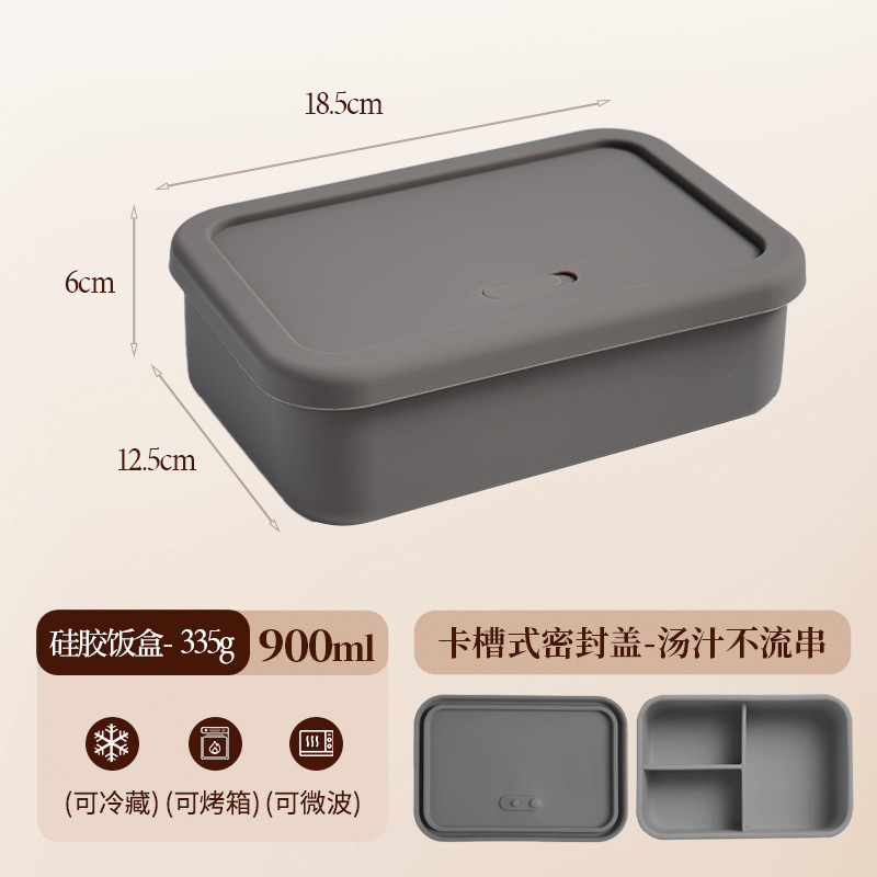Силиконовый ланч-бокс с тремя отделениями и дышащими отверстиями — серый, бежевый и белый.