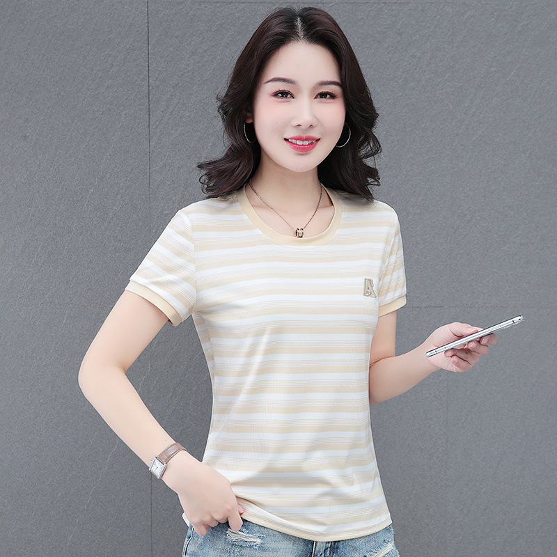 Главная страница > Футболка в полоску с круглым вырезом, женский короткий рукав, ледяной шелк, свободная тонкая летом 2025 новая рубашка с половиной рукава
