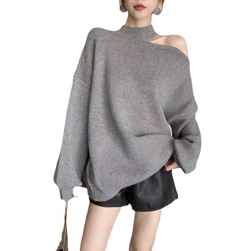Корейская версия с открытыми плечами сексуальная шея темпераментный свитер 2024 осень и зима новый пуловер свободный ленивый свитер женский прилив
