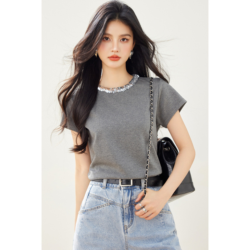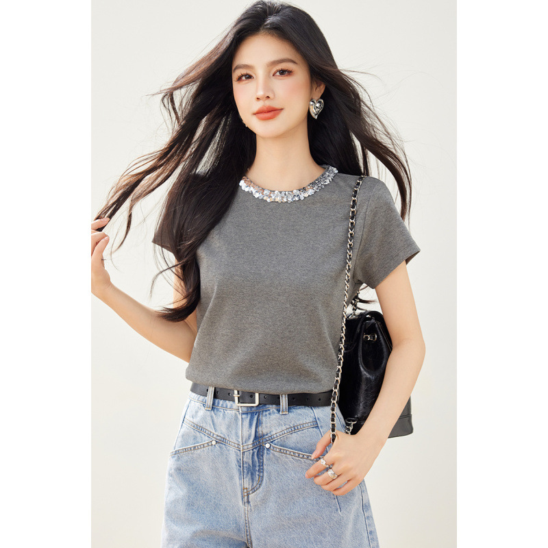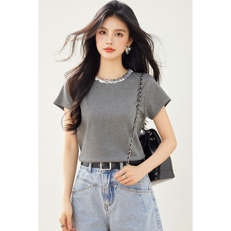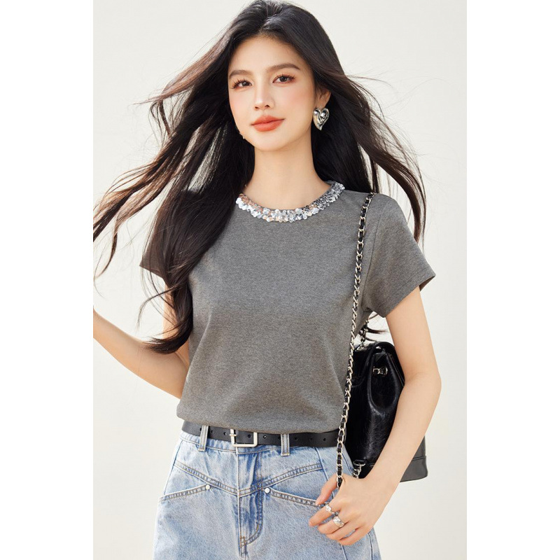 Модный дизайн с блестками и вырезом с круглым вырезом футболка с короткими рукавами