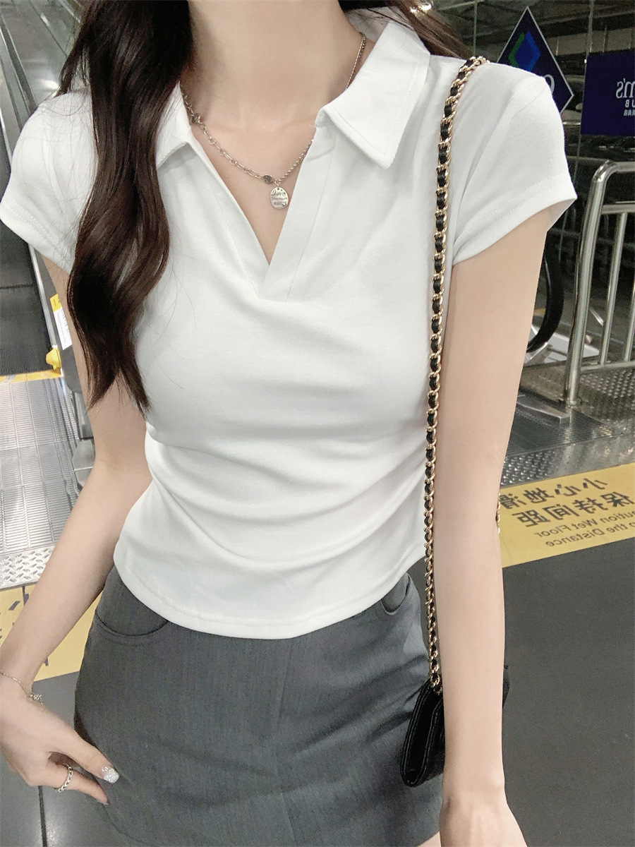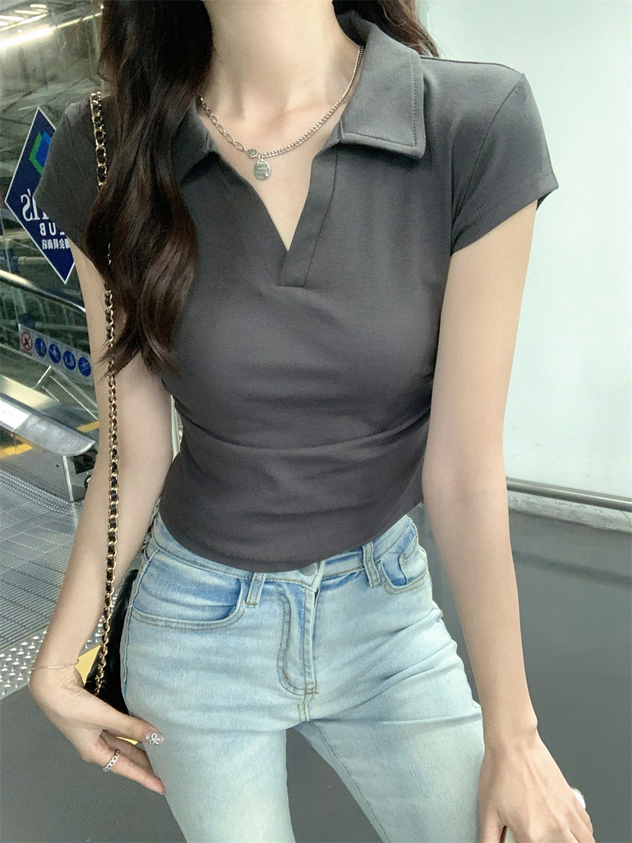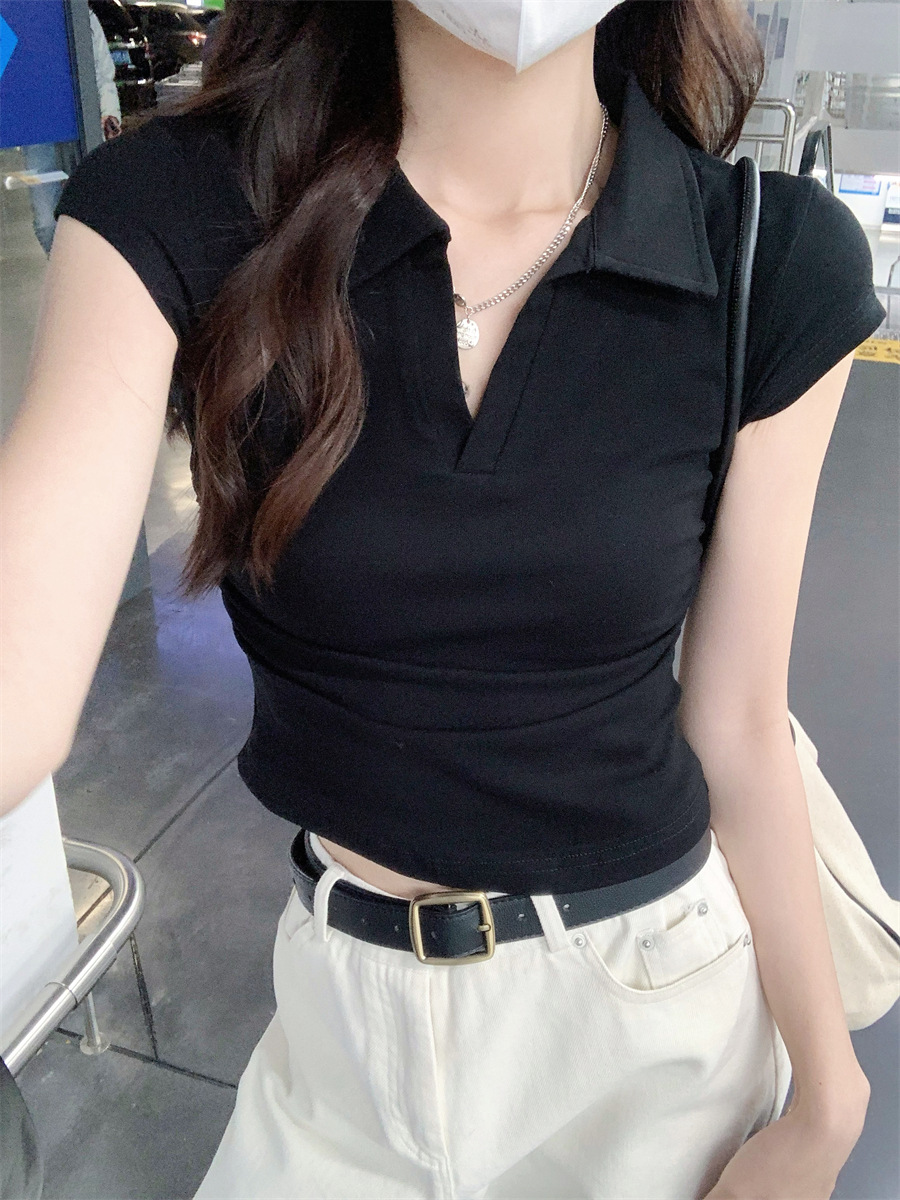 Главная страница > Летняя женская футболка-поло с коротким рукавом, приталенная, до плеч, укороченная, с драпировкой, в стиле «спайси гёрл».