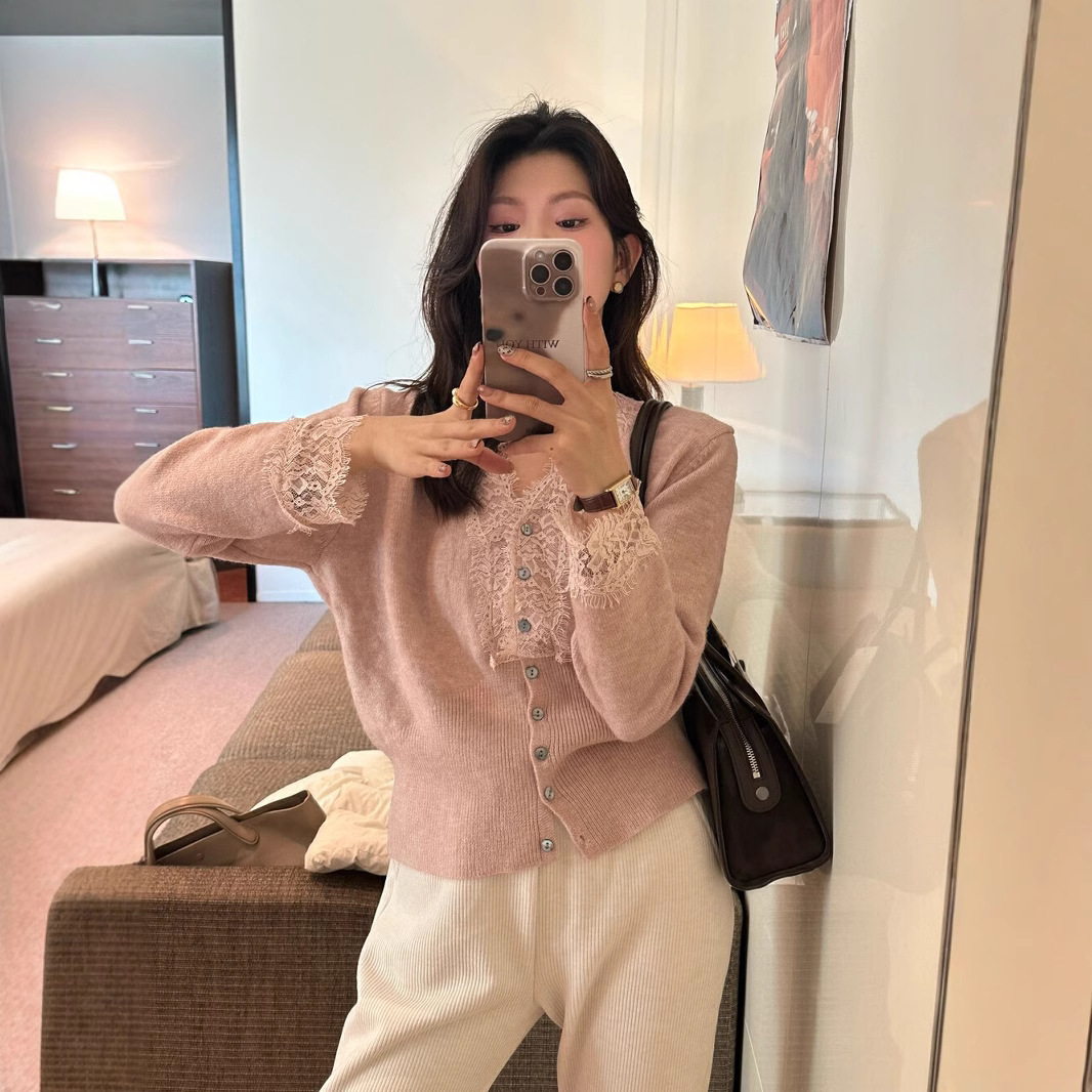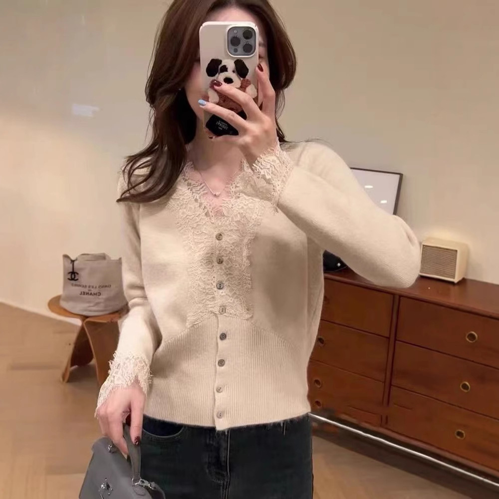 Главная страница > Кашемировый дизайн Ashi Mi дикий нишевый кружевной сшитый нижний свитер с V-образным вырезом трикотажный кардиган женский