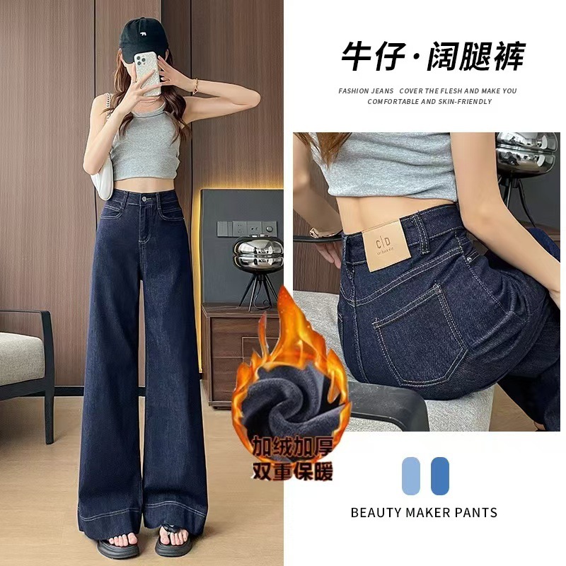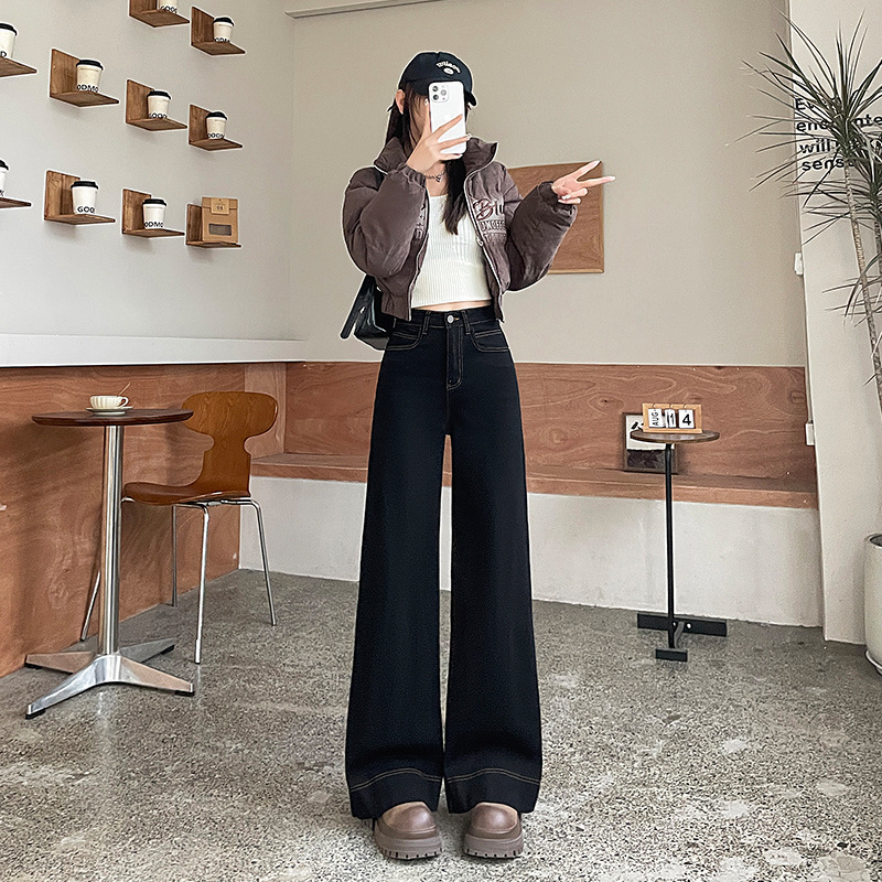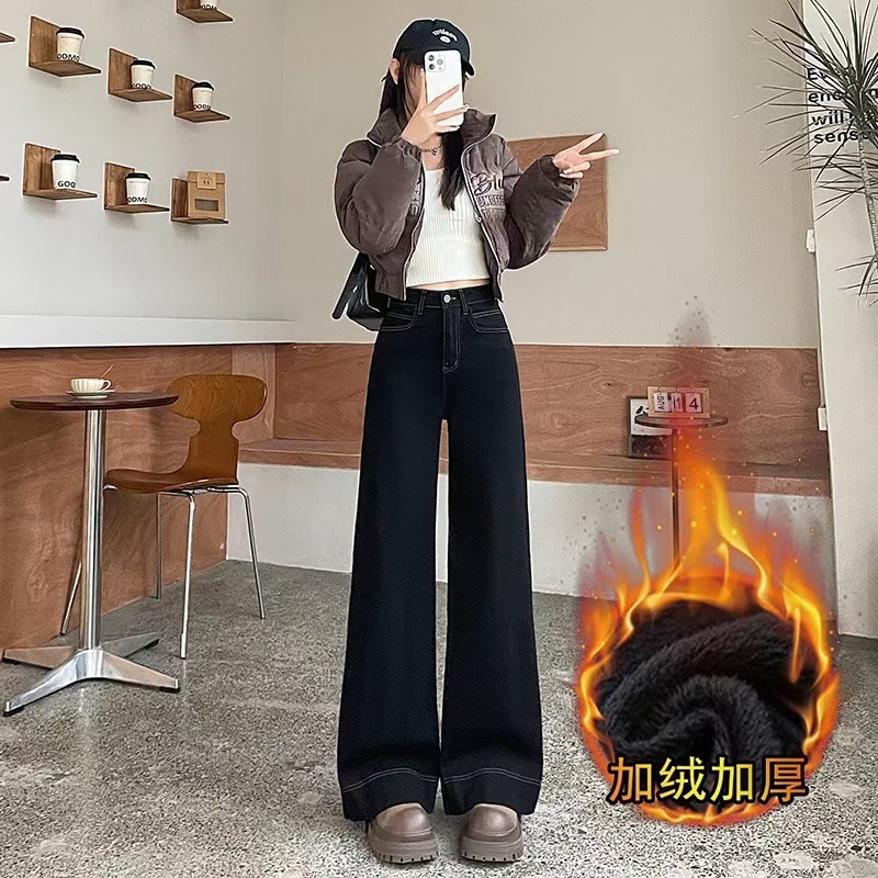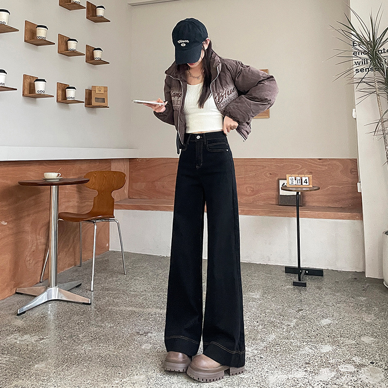Главная страница > Черные широкие джинсы для женщин, популярный стиль осени и зимы 2025 года, новые утепленные брюки с высокой талией, облегающие, в пол, для миниатюрных фигур.