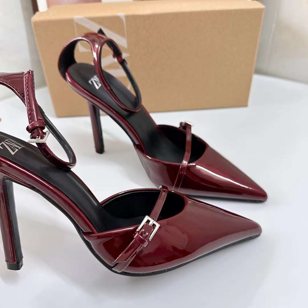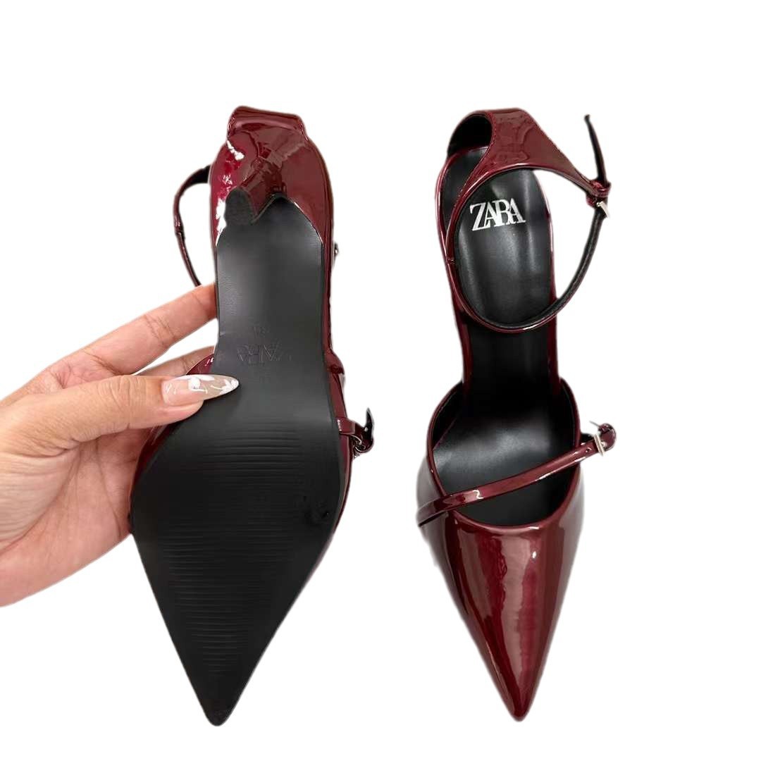 2024 новые осенние женские туфли в винно-красной лакированной коже с заостренной и неглубоким ртом на высоких каблуках