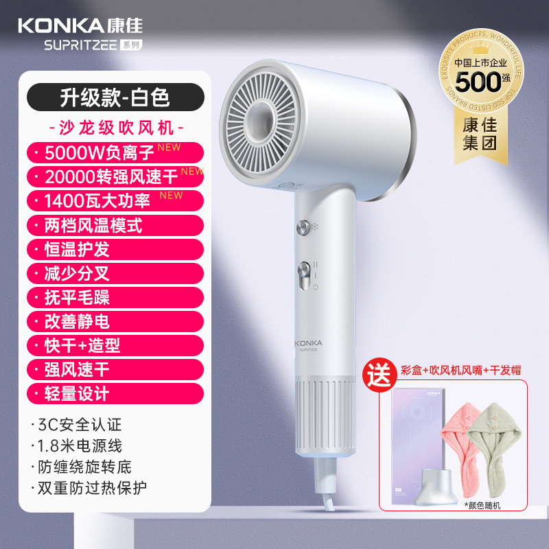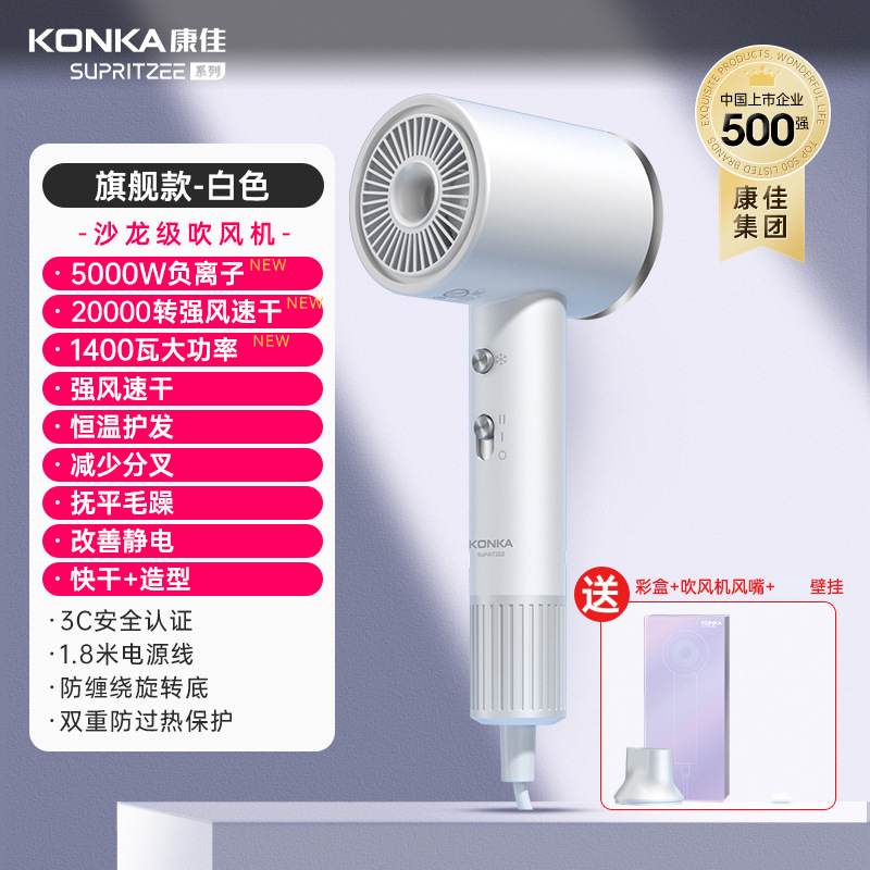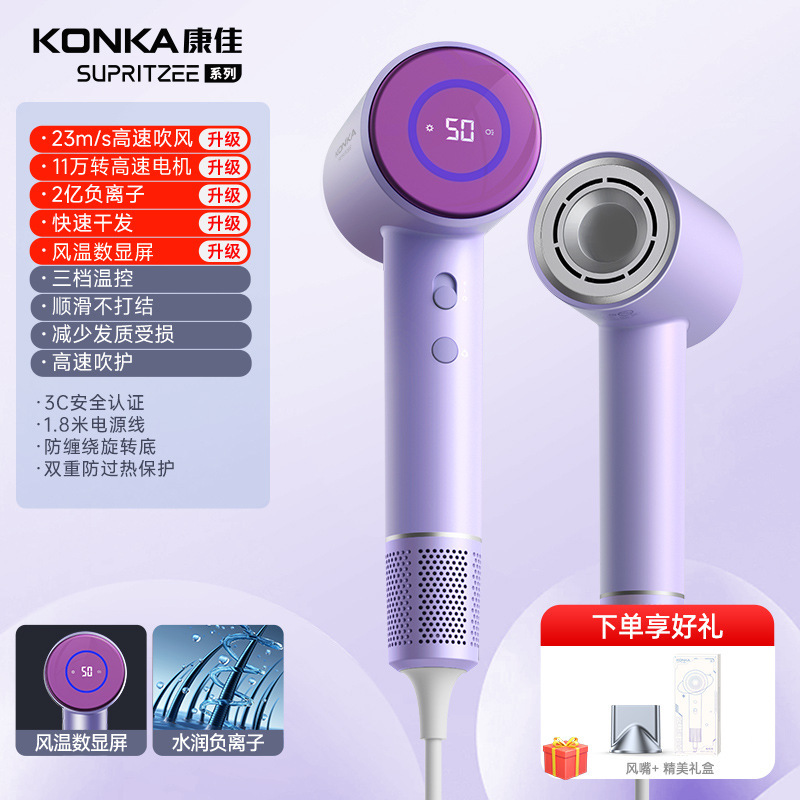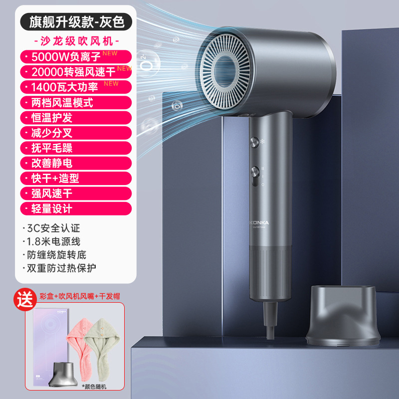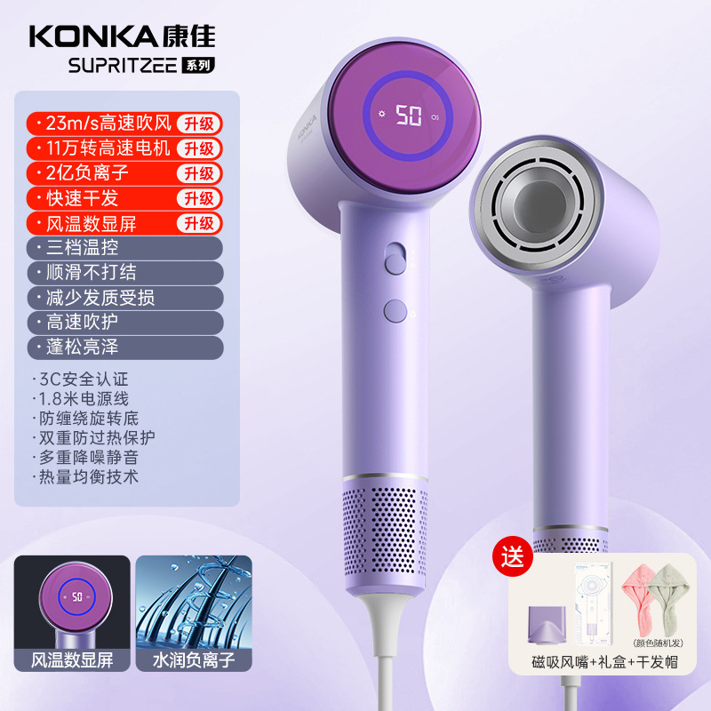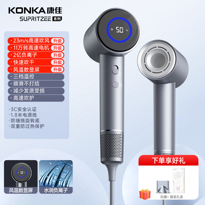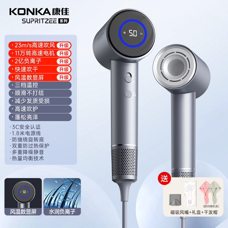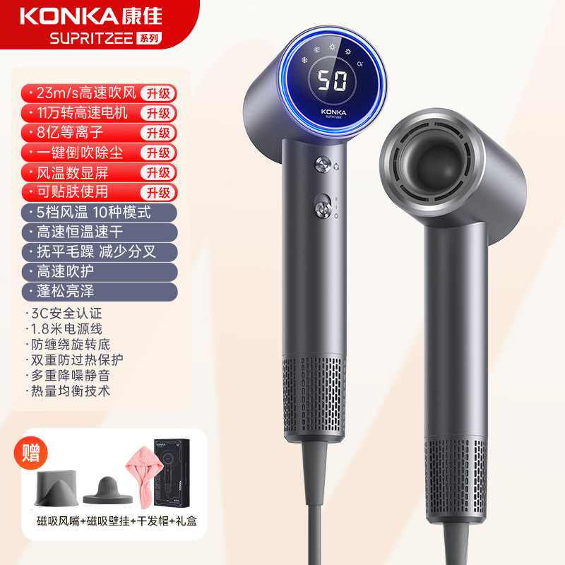 Konka [N1-M] Серый - 400 миллионов плазмы + высокая скорость 110 000 об/мин + цифровой дисплей температуры воздуха + удаление пыли с обратным выдувом + магнитная воздушная насадка + настенное крепление + шапочка для сушки волос