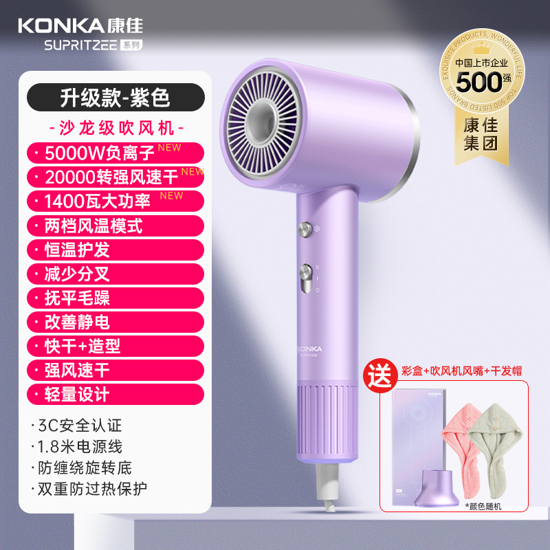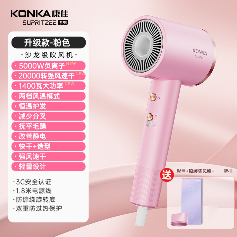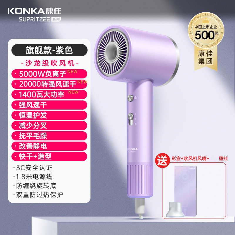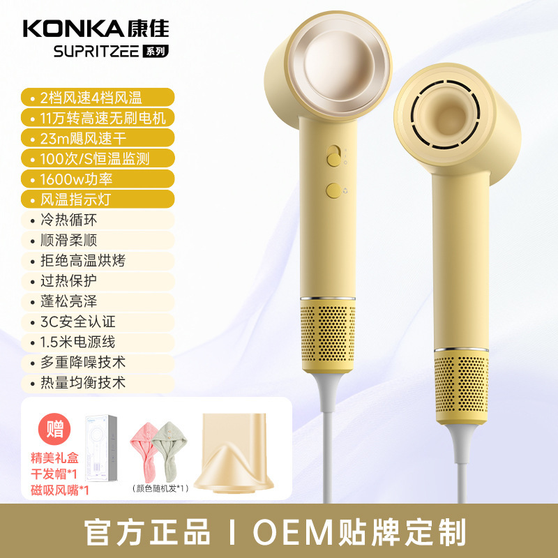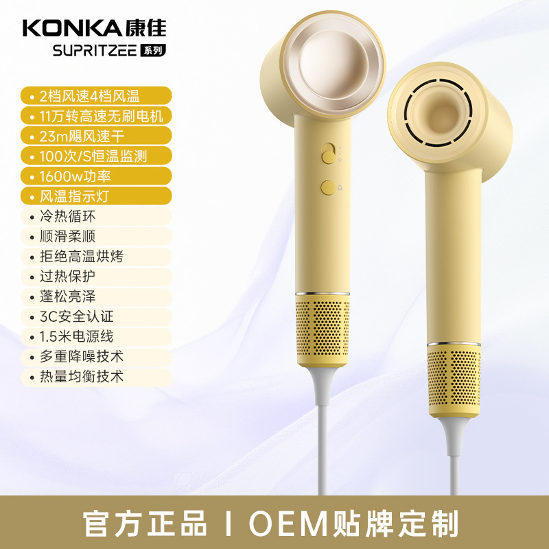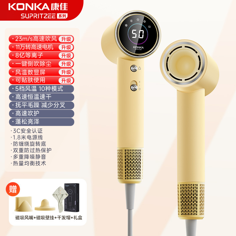 Konka [N1-M] Желтый - 400 миллионов плазмы + высокая скорость 110 000 об/мин + цифровой дисплей температуры воздуха + удаление пыли с обратным выдувом + магнитная воздушная насадка + настенное крепление + шапочка для сушки волос