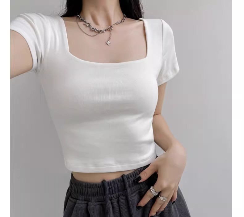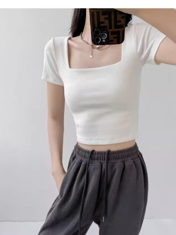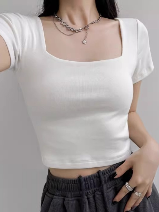 Главная страница > Короткая белая женская футболка с квадратным вырезом, европейско-американский стиль с короткими рукавами, сладкая и пряная ниша, укороченный универсальный летний топ с высокой талией.