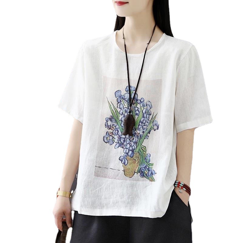 Главная страница > Хлопковая и льняная рубашка с короткими рукавами для женщин 2025 летнее платье новый женский топ свободный ретро принт большой размер женской футболки