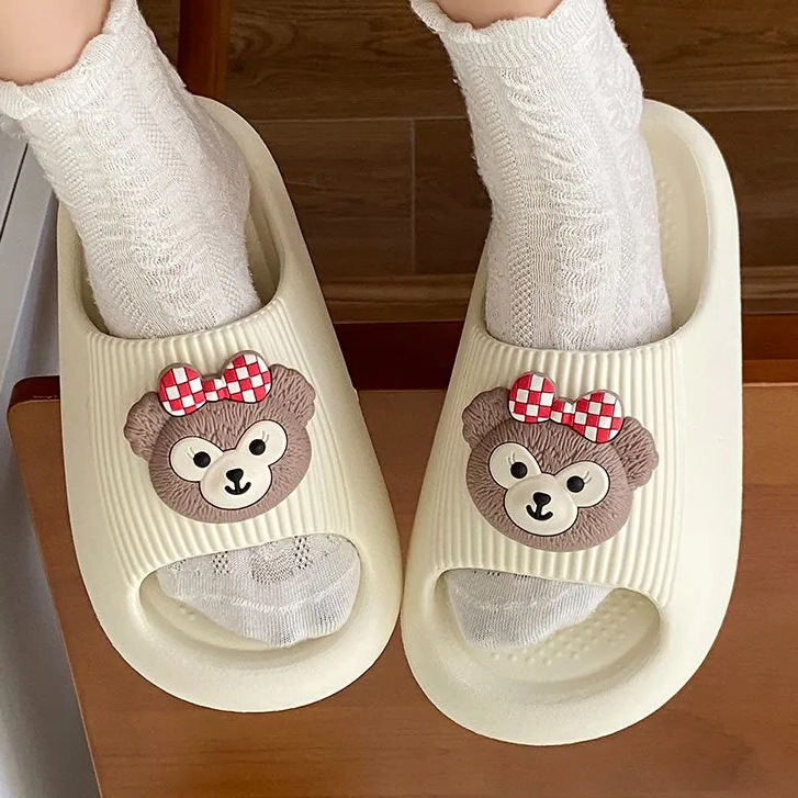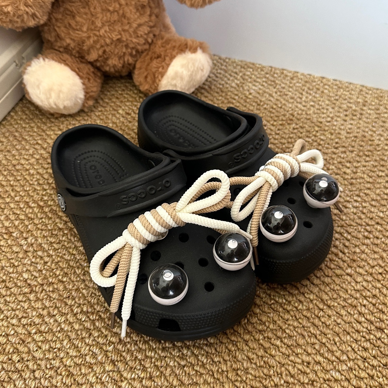Белые и черные ремешки, черный бант, черная шляпа, медвежонок Дэффи с пуговицей в верхней части.
