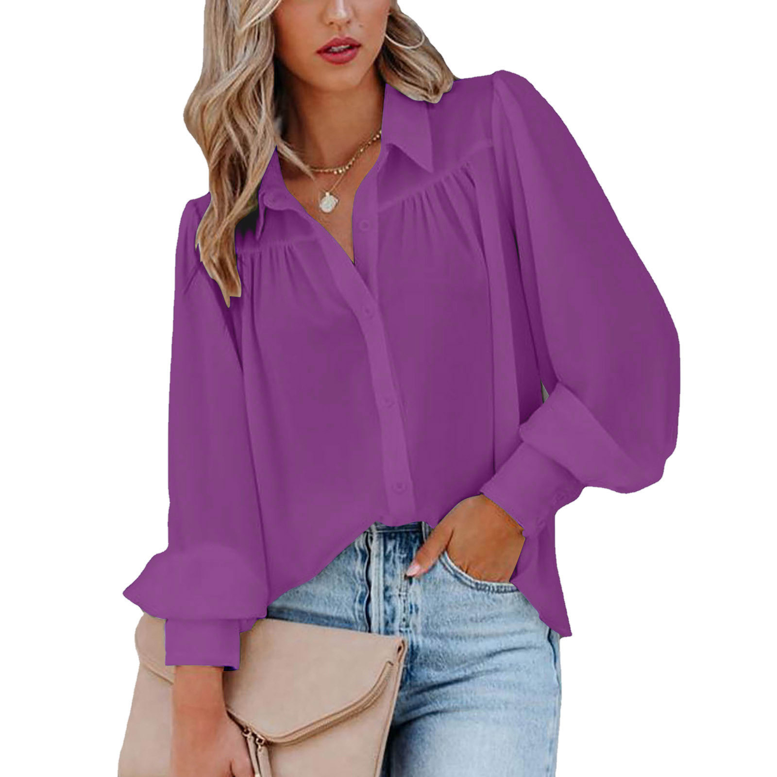 Главная страница > Европейские и американские трансграничные 2024 новые амазонские пуговицы с плиссированными рукавами фонарь сплошной цвет свободная рубашка с длинными рукавами женская одежда