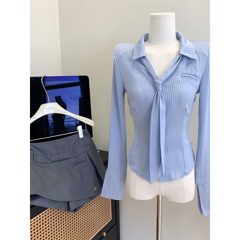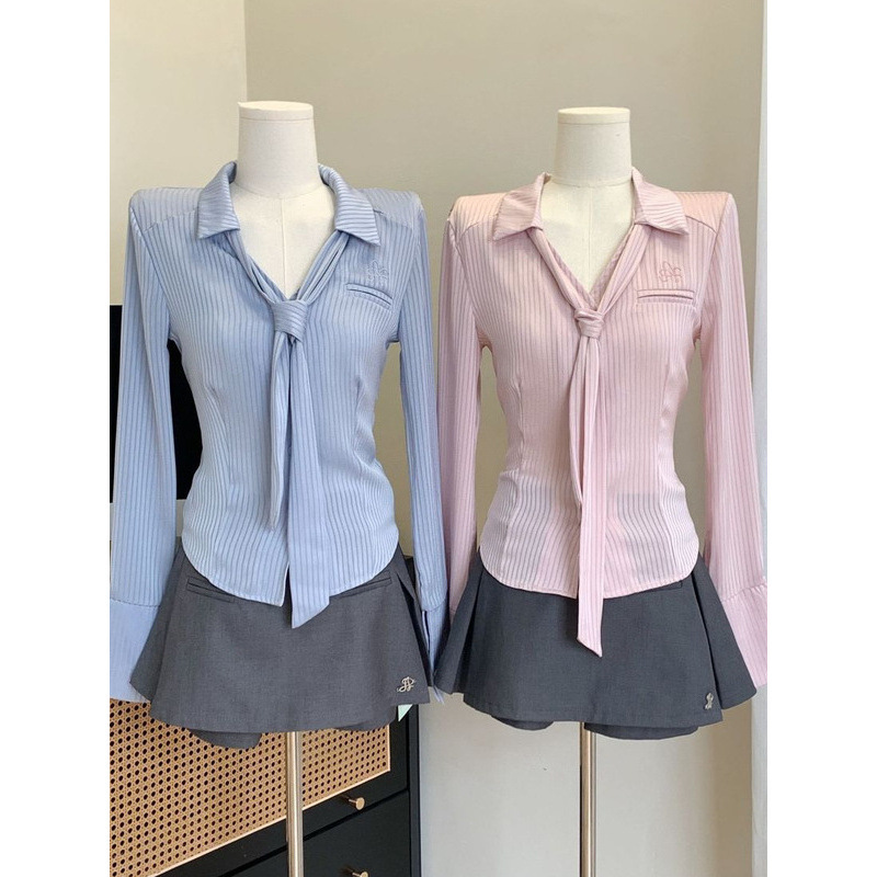 Главная страница > Розовая полосатая рубашка с лентой для женщин, весна-лето 2025, синий топ с длинными рукавами, подчеркивающий талию, модный и молодежный стиль преппи.