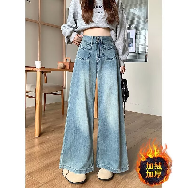 Плюс размер ретро бархатные джинсы дамы осенью и зимой толстые мм свободные с высокой талией тонкие прямые брюки с широкими ногами