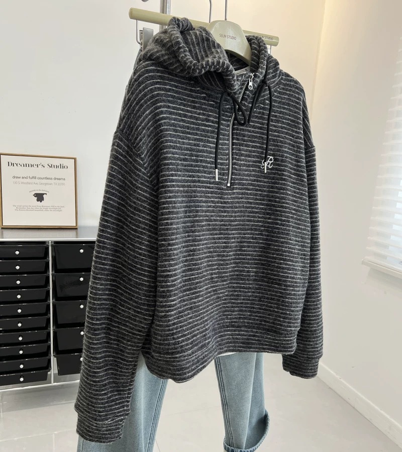 Главная страница > Весенний полузастежка-молния в полоску с капюшоном свитер корейская версия ретро нежная свободная тощая ленивая толстовка с капюшоном