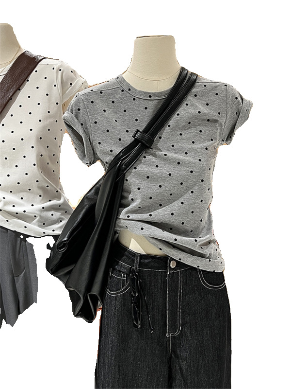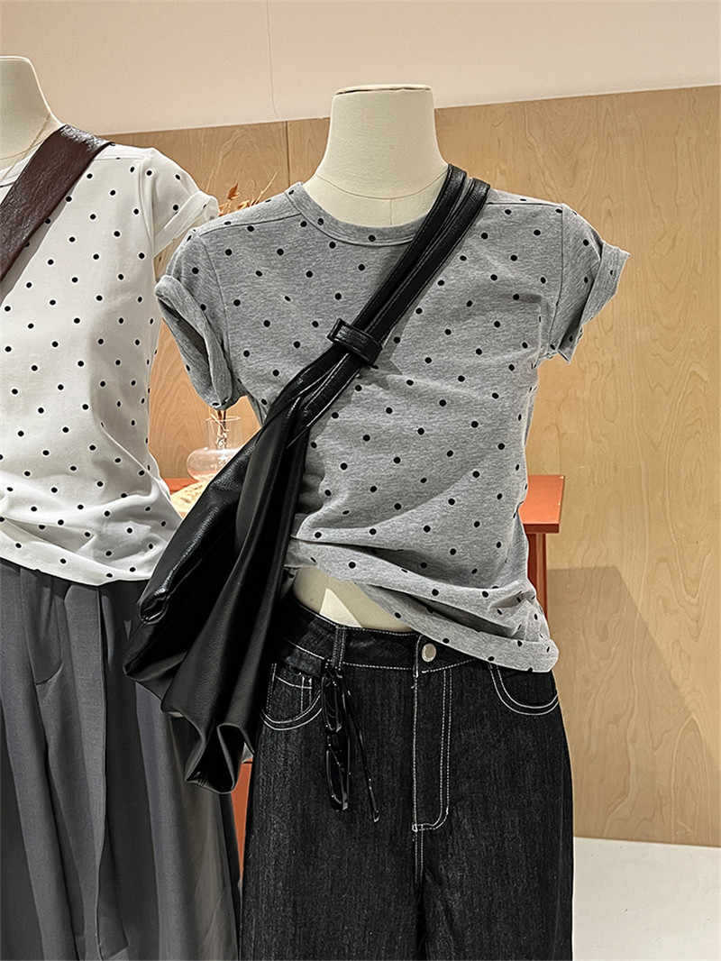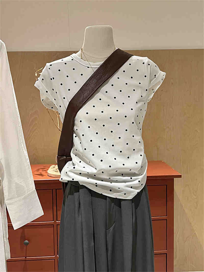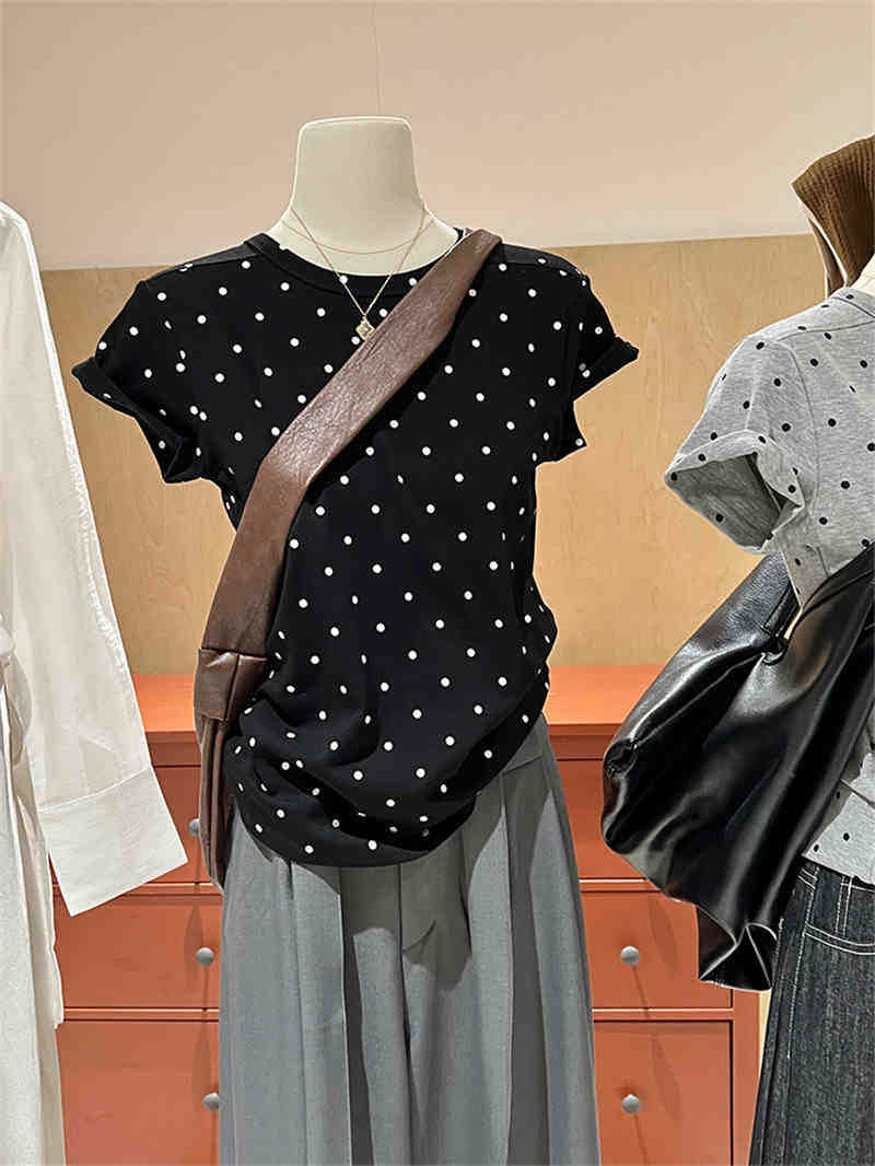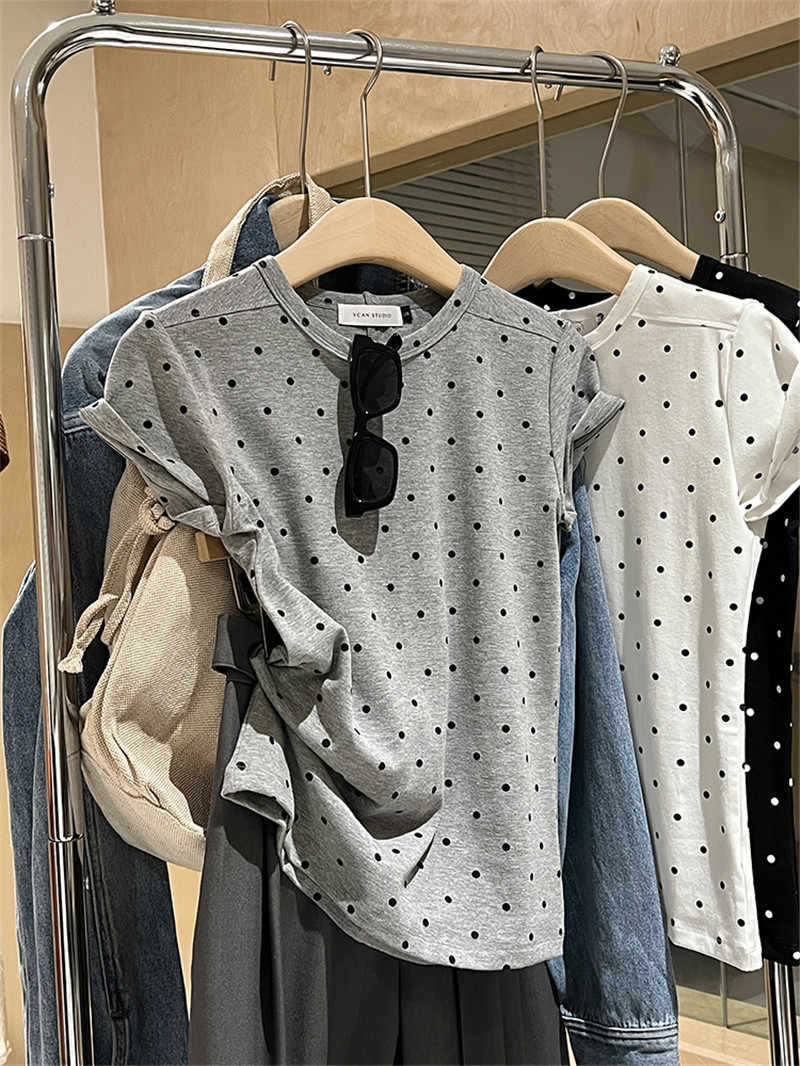 Футболка с волновой точкой для женщин с короткими рукавами на плече и тонким круглым вырезом на нижней части ретро сладкий и пряный дизайн шикарный топ в горошек