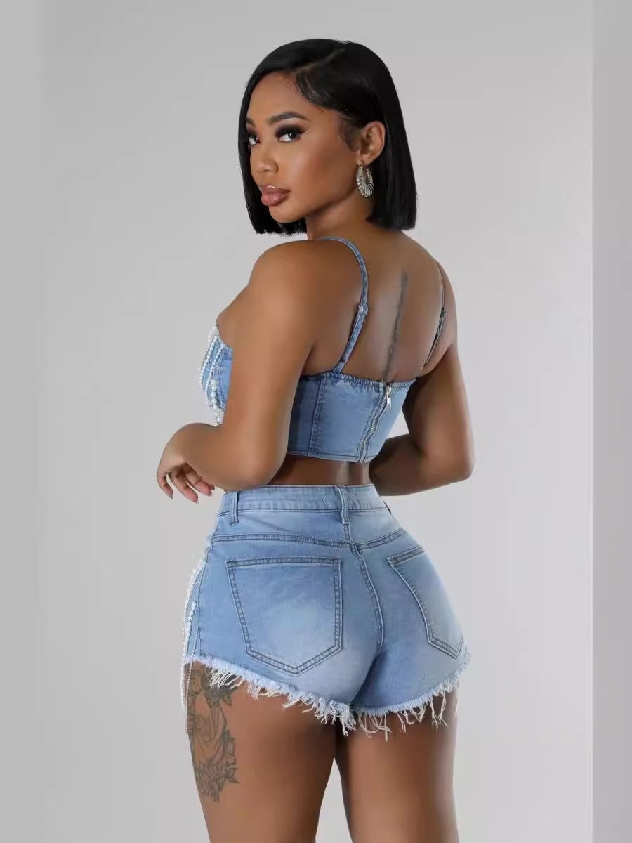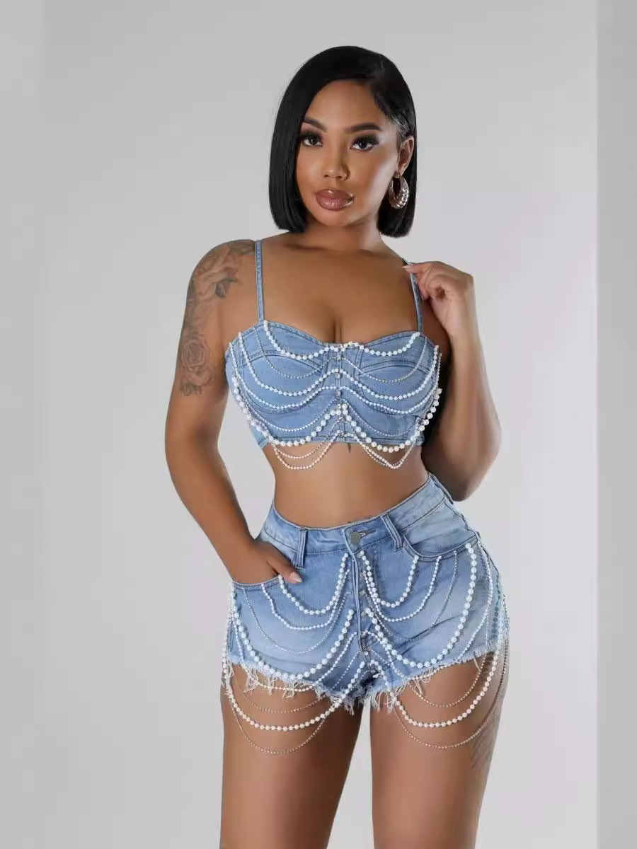 2024 Трансграничные Европа и США ins Жемчужная цепочка бриллиантовый джинсовый жилет шорты набор сексуальная горячая девушка набор из двух частей