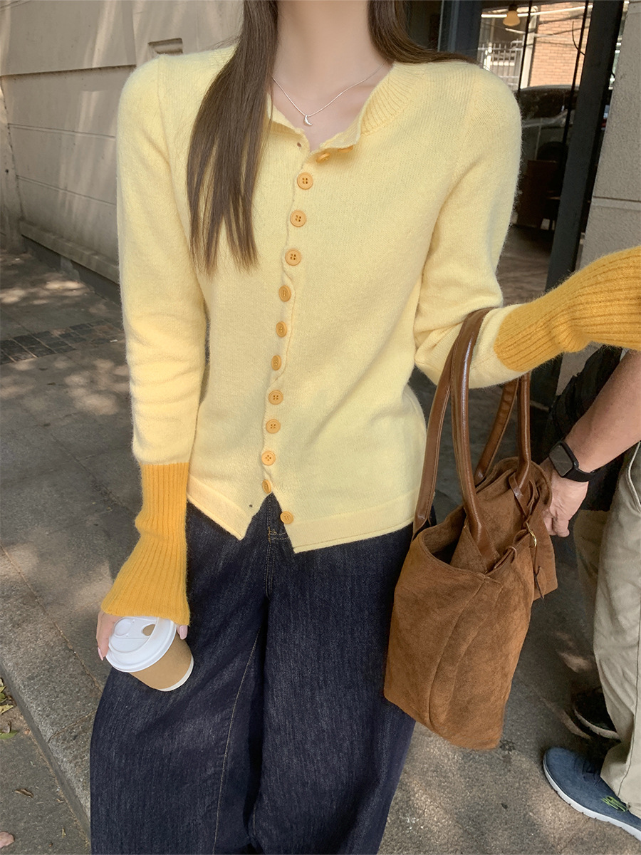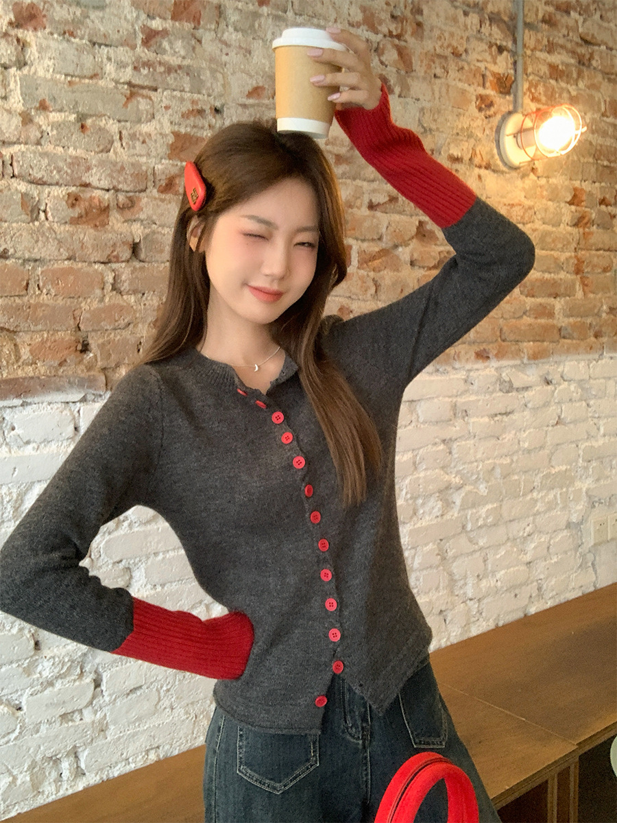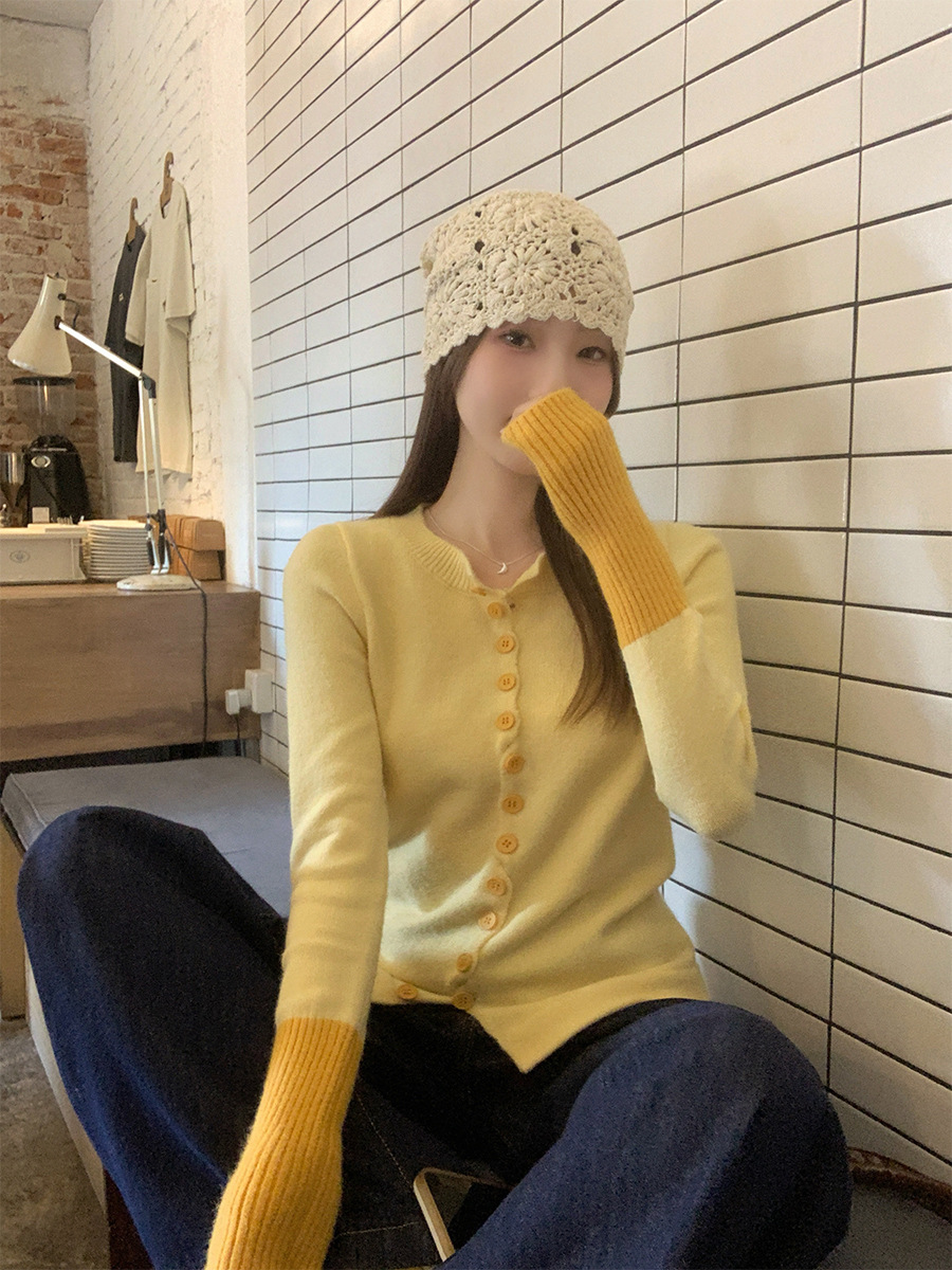 Шикарный цвет контрастный дизайн трикотажный кардиган куртка женская осень-зима новый сладкий тонкий тонкий с длинными рукавами нишевые топ