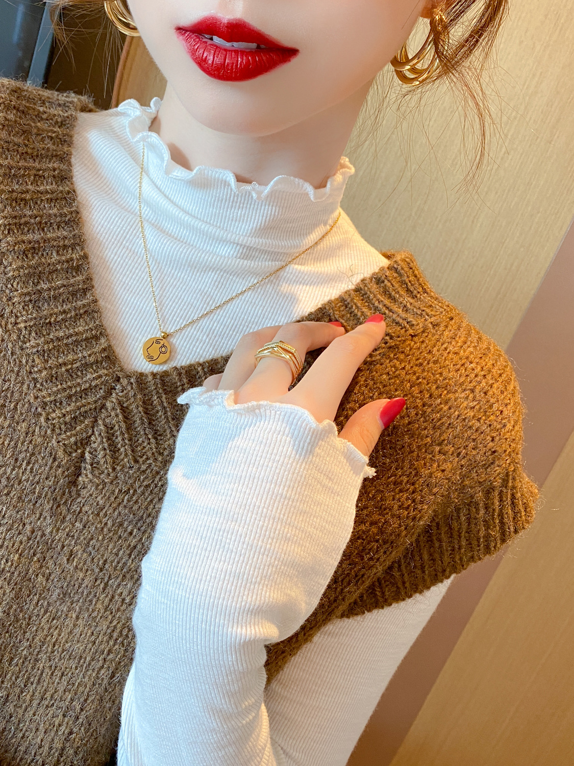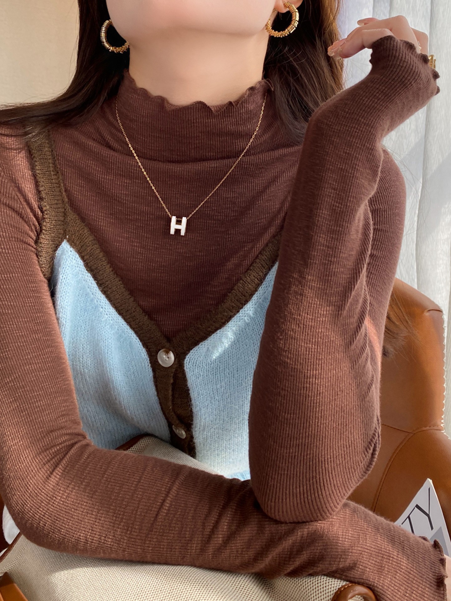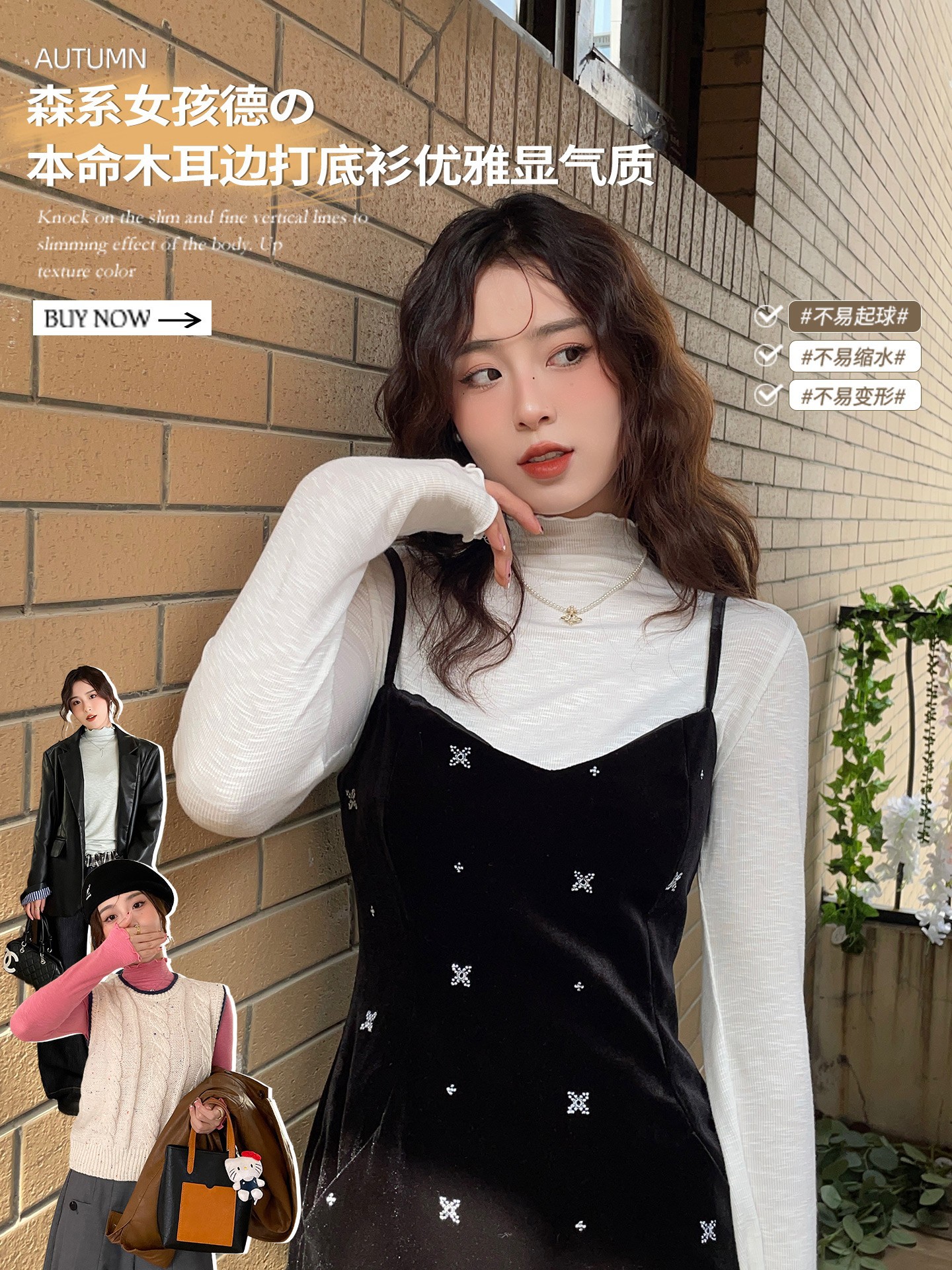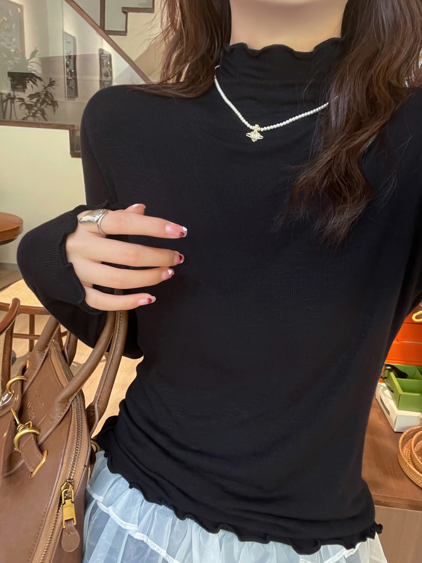 Главная страница > Женская базовая футболка с воротником-стойкой, тонкая футболка с длинным рукавом для многослойного образа, осенний топ 2025 с оборками, приталенный крой для женщин.