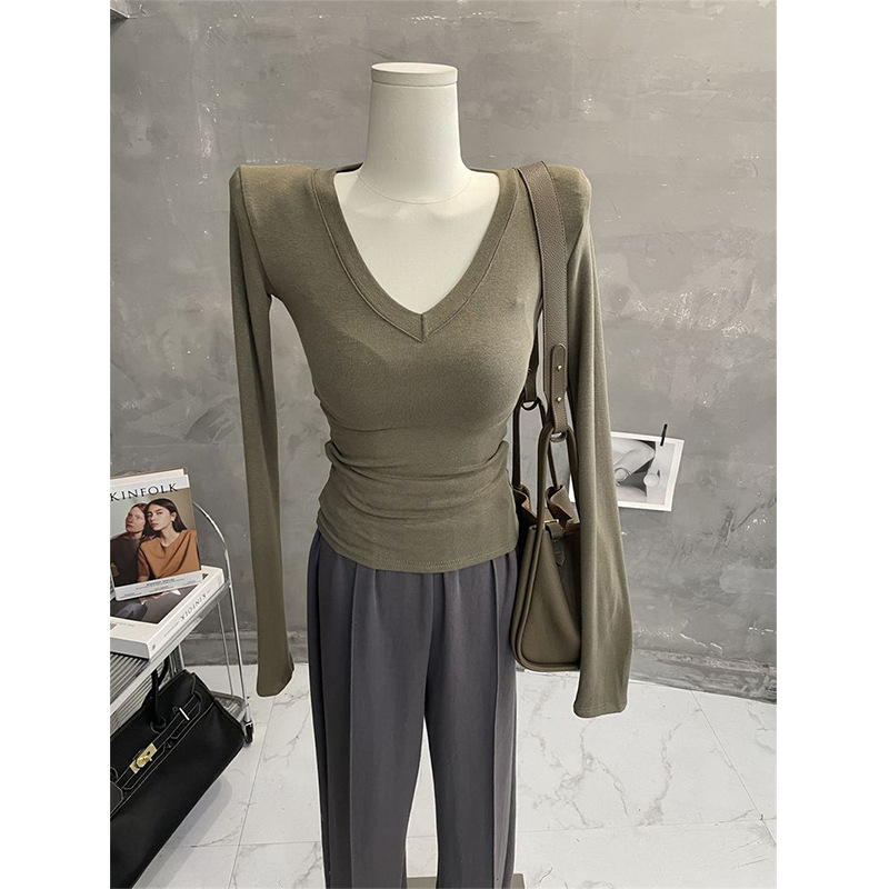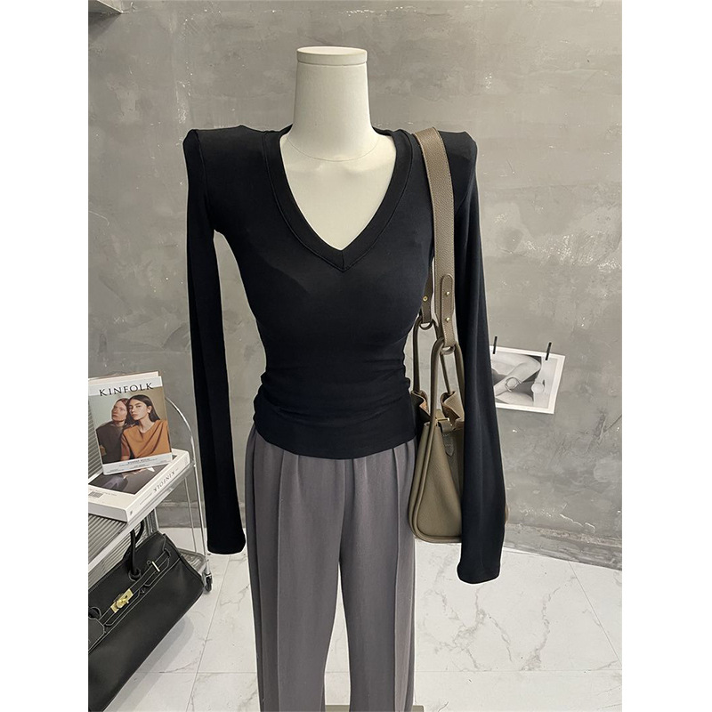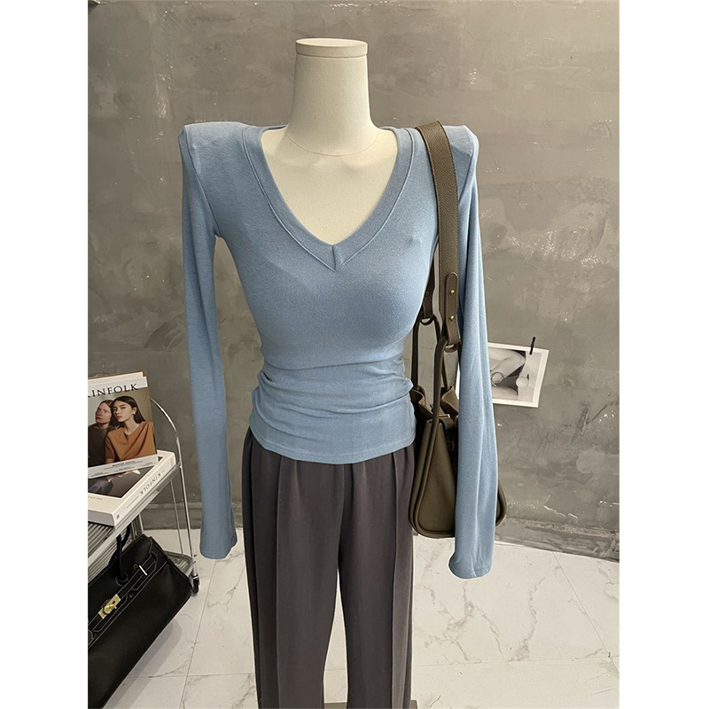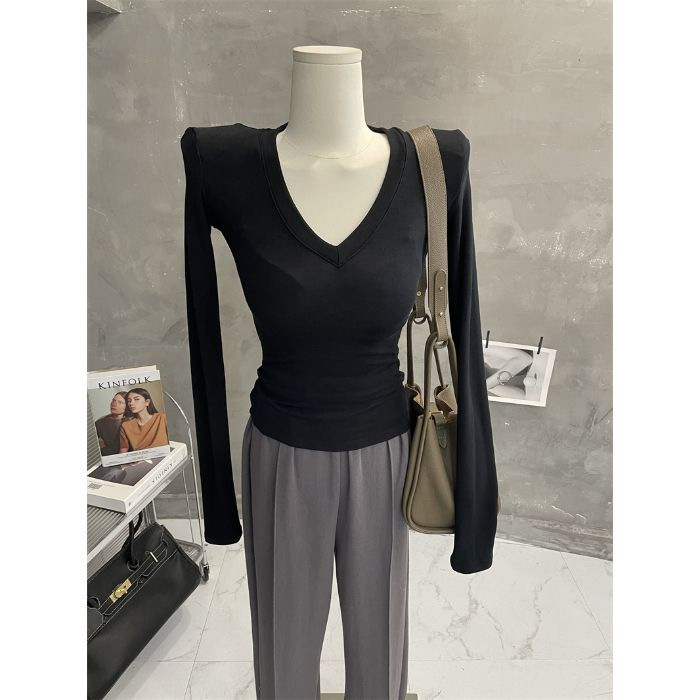 Главная страница > Приятная для кожи мягкая сексуальная женская футболка с V-образным вырезом и длинными рукавами, тонкая слегка прозрачная базовая рубашка, плотный однотонный топ для модного многослойного ношения.