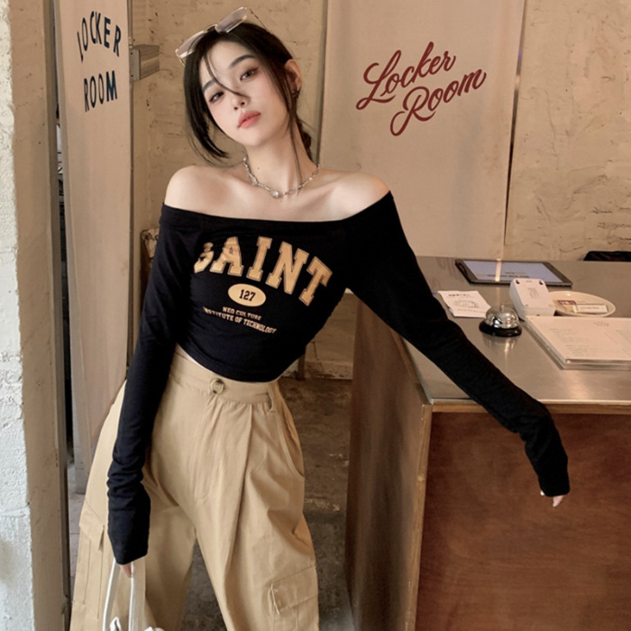 Главная страница > Осень 2023 новая горячая модная футболка для девочек, женская тонкая футболка с короткими открытыми плечами и длинным рукавом, топ, женская мода