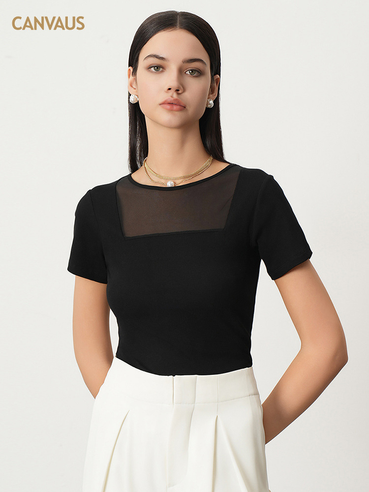 CANVAUS новая перспективная сетчатая футболка с короткими рукавами с круглым вырезом Летний черный тонкий полый дикий топ