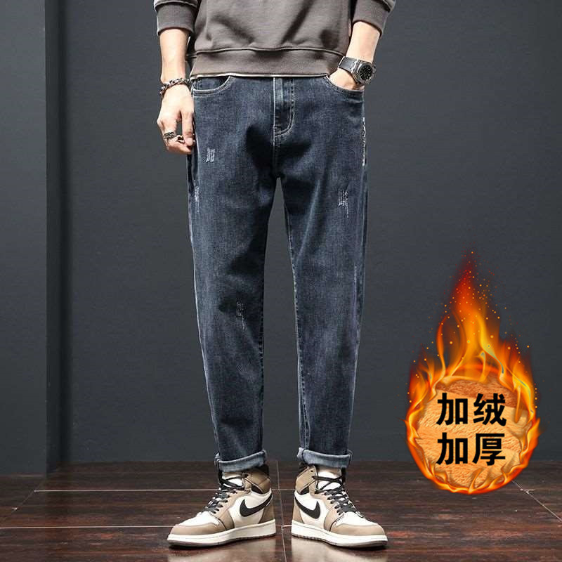Главная страница > Мужские джинсы на флисовой подкладке, новая осенне-зимняя модная коллекция, свободные прямые брюки стрейч, облегающие повседневные длинные штаны