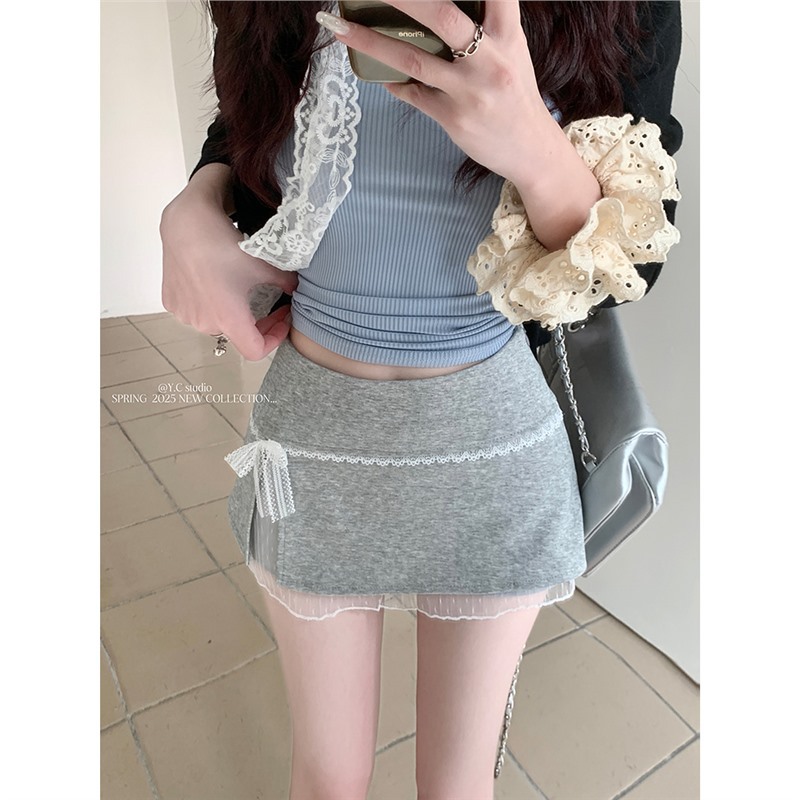 Главная страница > Лук, кружевная сшитая юбка, женская летняя анти-легкая девушка, бедра, короткая юбка, серая юбка с высокой талией