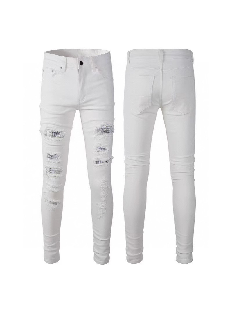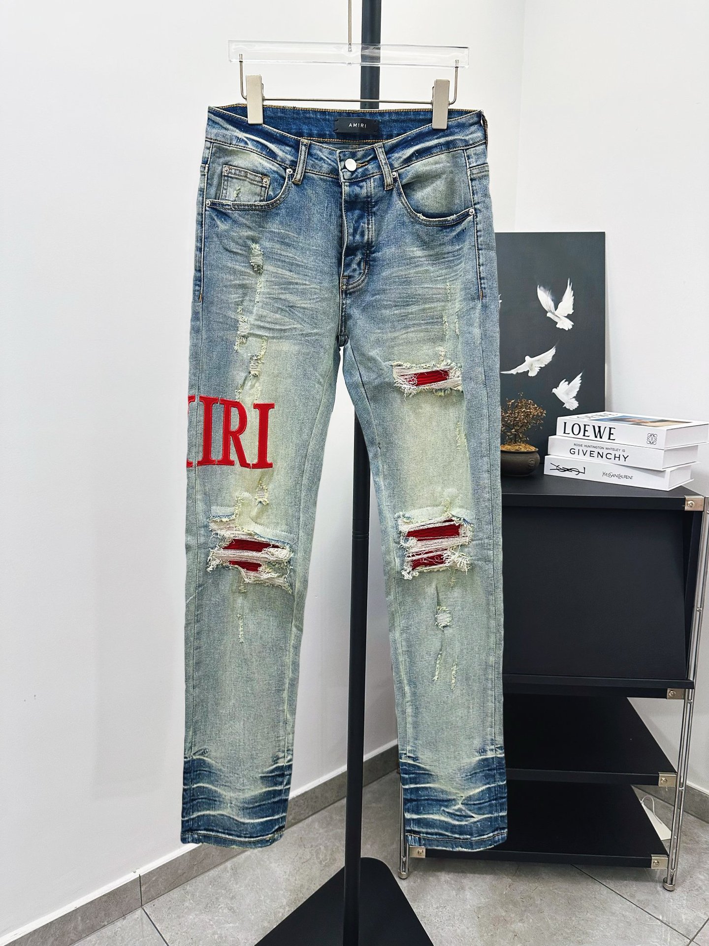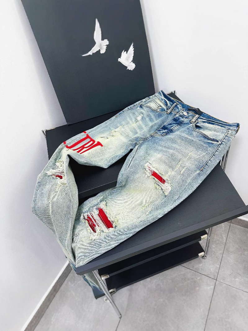 Мужские джинсы Amiri, красные, с вышивкой, драпированные, потертые, приталенного силуэта, премиум-класса, оптом, топ-рейтинг.