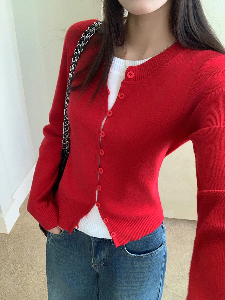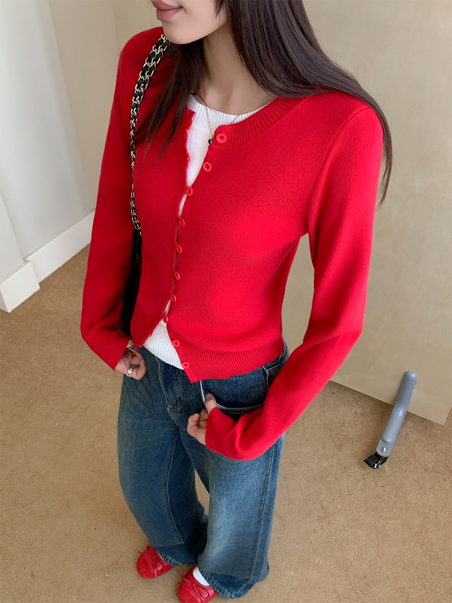 Рождественский красный искусственный вязаный кардиган из двух частей с длинными рукавами, женская осенне-зимняя внутренняя одежда, милая сексуальная многослойная куртка с круглым вырезом, топ