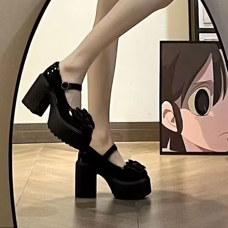 Главная страница > Модные женские маленькие кожаные туфли на высоком каблуке с бантом, новинка осени 2024, туфли Мэри Джейн на толстом каблуке и юбке с одной линией пряжки