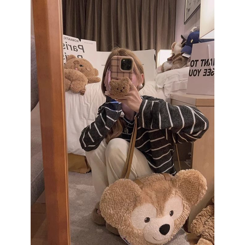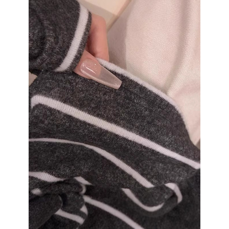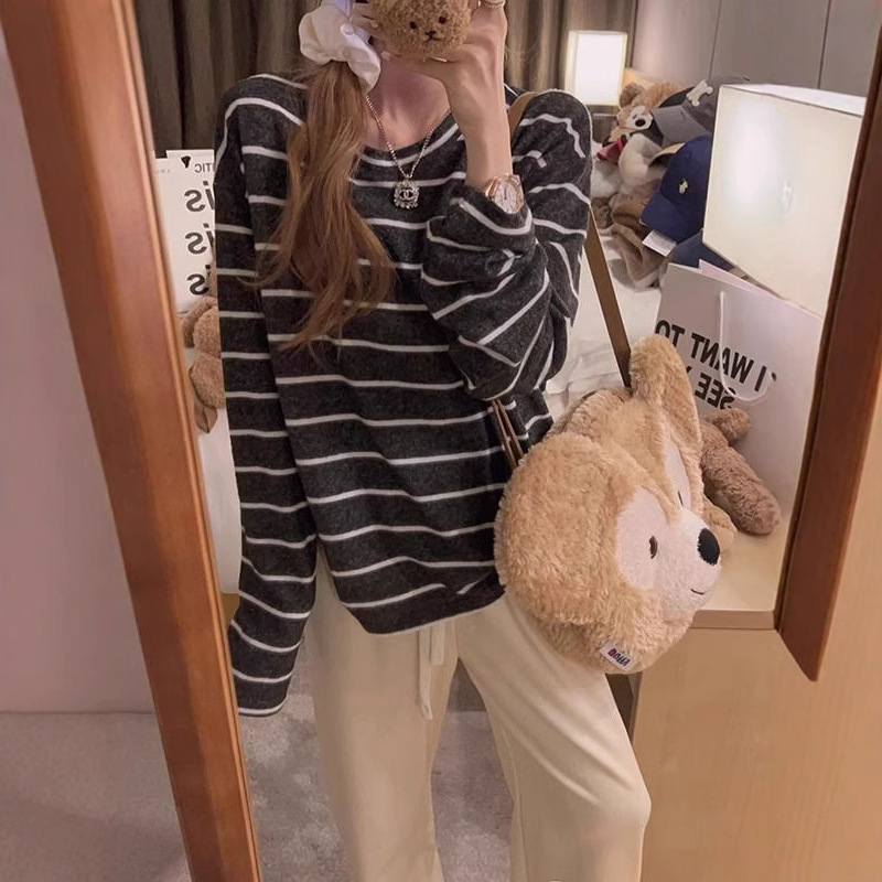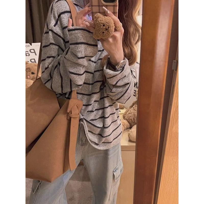 Главная страница > Светло-серая полосатая футболка с длинными рукавами и начесом для женщин, осень и зима, ленивый стиль, свободная и утолщенная базовая рубашка.