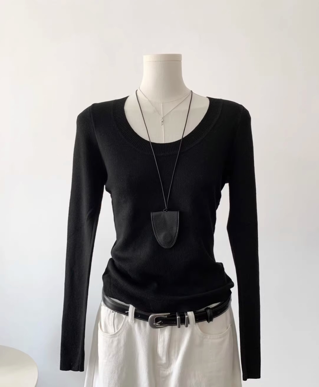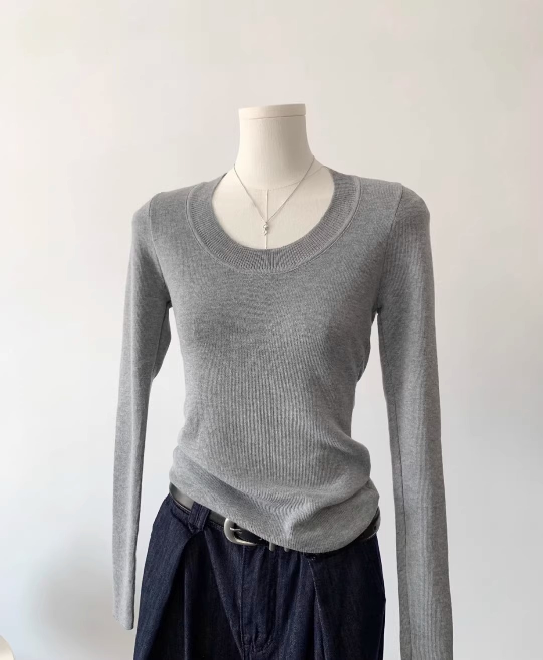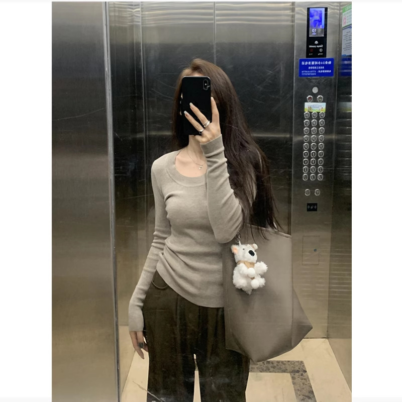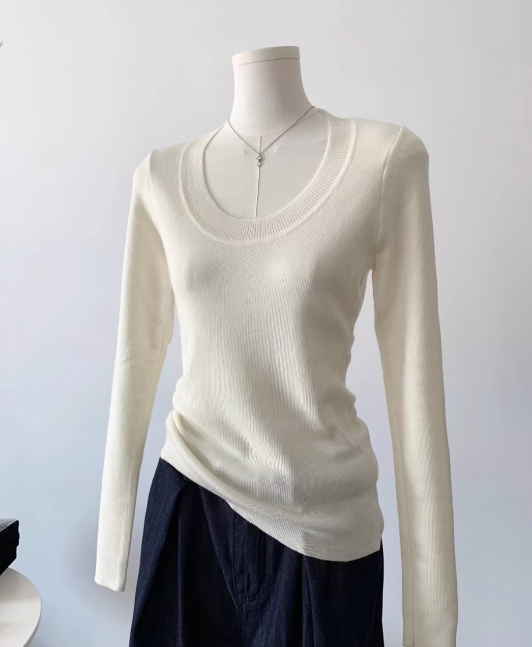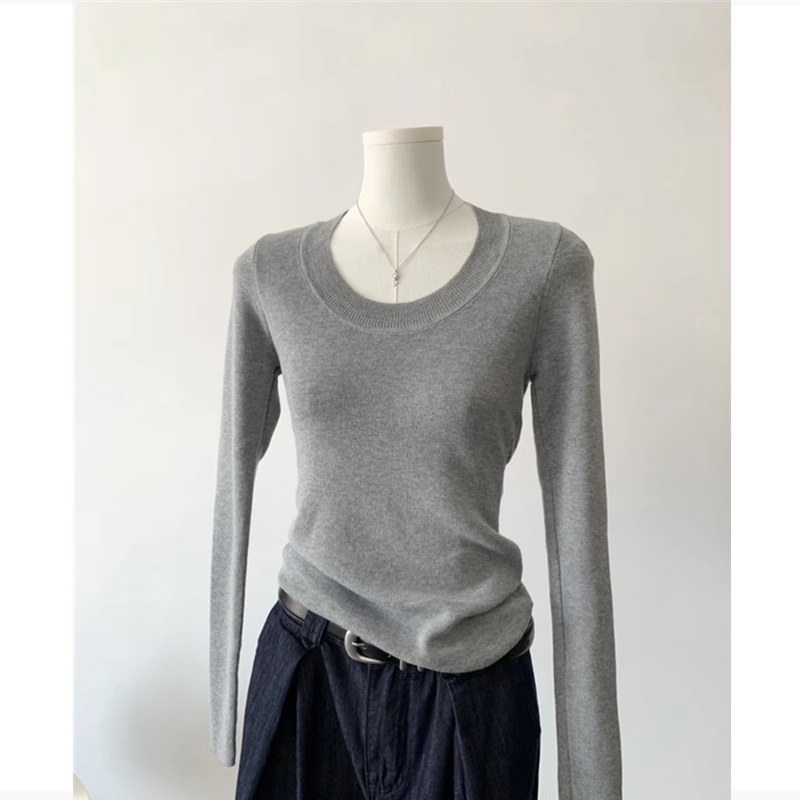 Главная страница > Однотонный трикотажный свитер с U-образным вырезом для весны, осени и зимы, облегающий, сексуальный стиль, базовый слой для женщин, однотонный топ.