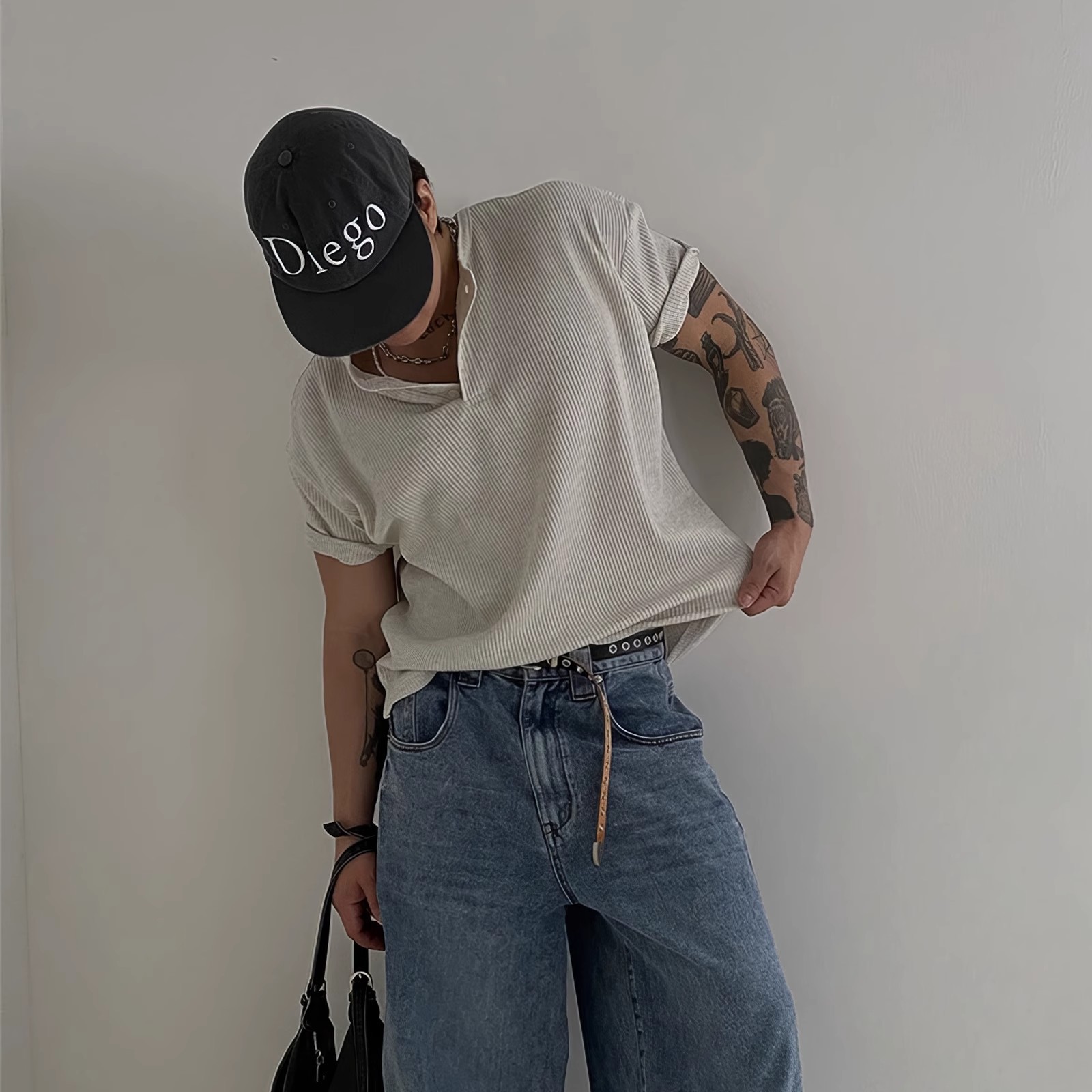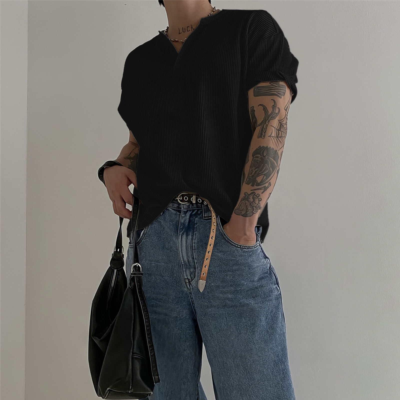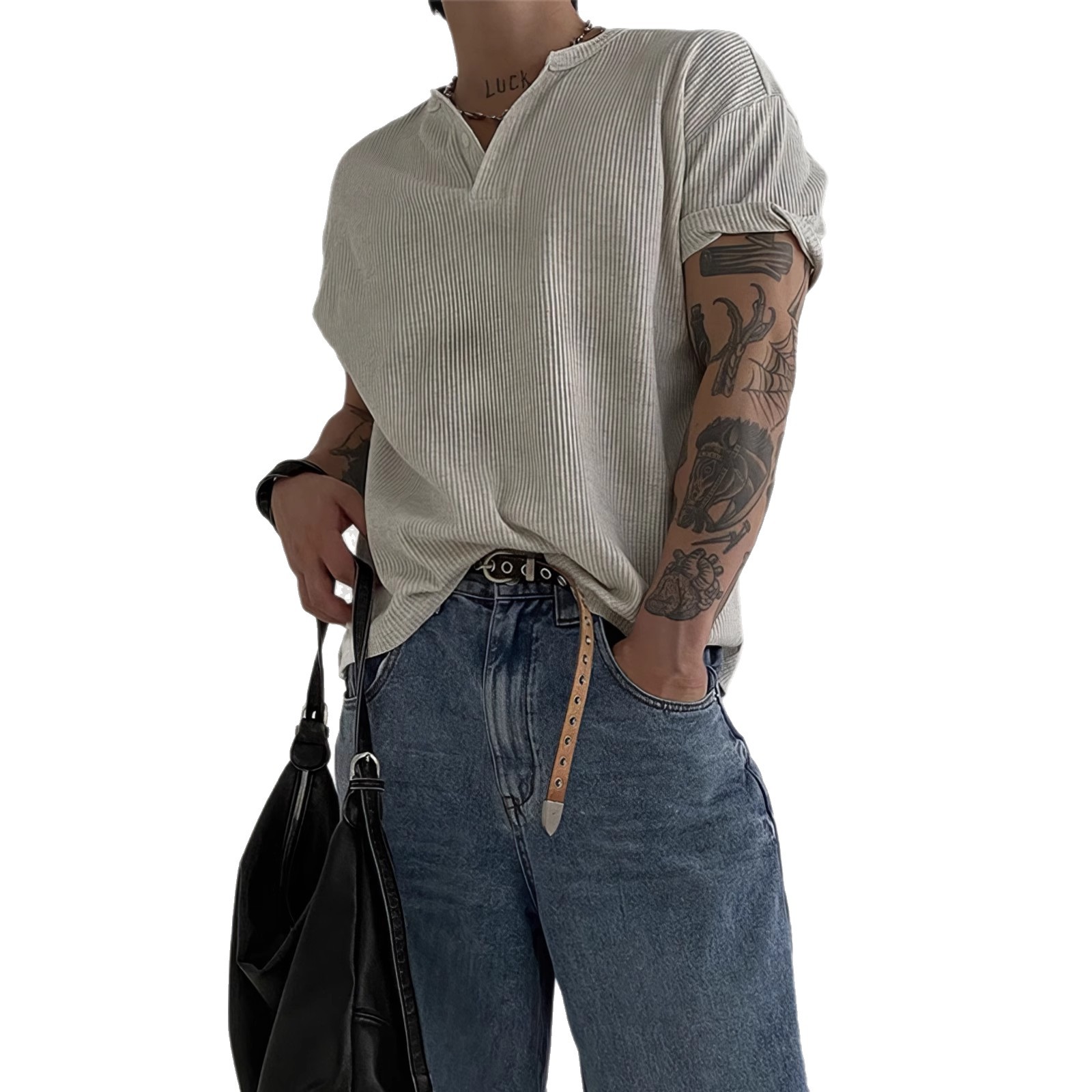 Главная страница > Мужская летняя футболка с коротким рукавом, вафельная текстура, воротник «хенли», американский стиль, легкая, дышащая, с боковыми разрезами.