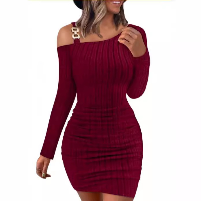 Главная страница > 2023 Европейское женское однотонное облегающее платье с открытыми плечами и косым воротником, облегающее бедра, модное тонкое сексуальное платье с длинными рукавами
