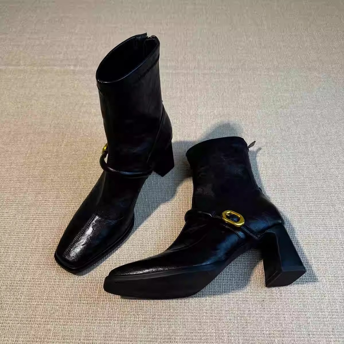 Главная страница > Версия из воловьей кожи ~ тонкие женские ботинки на высоком каблуке с квадратным носком, короткие ботинки из мягкой кожи на толстом каблуке во французском стиле с молнией сзади, эластичные модные ботинки