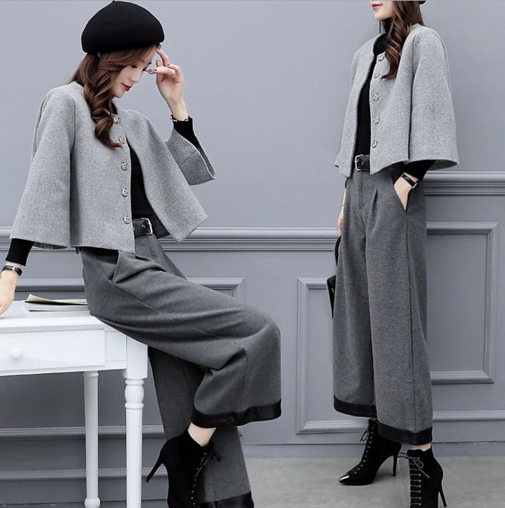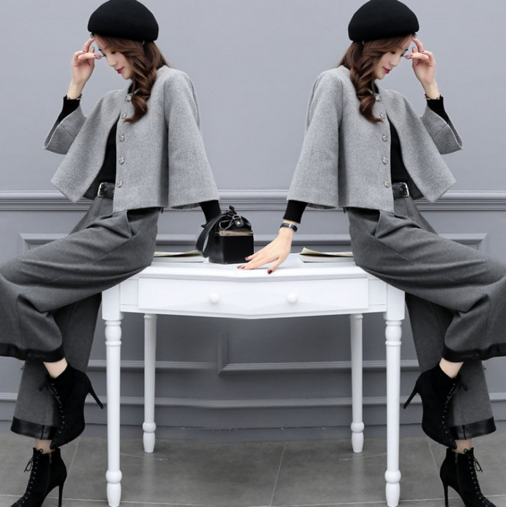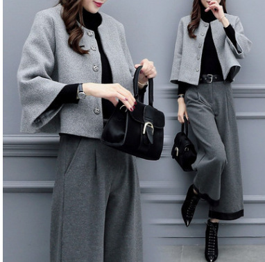 Главная страница > 2025 новый женский осенне-зимний костюм больших размеров из шерсти: короткий жакет и широкие брюки, модный повседневный костюм для женщин
