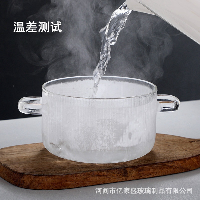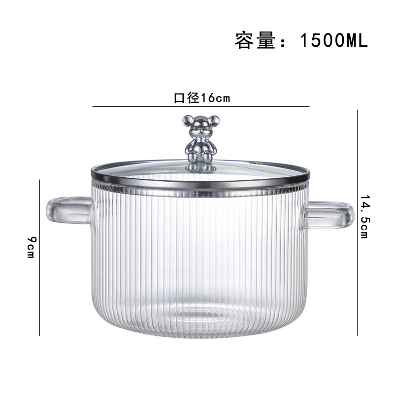 Главная страница > Утолщенный стеклянный горшок с двумя ушками в виде медведя, прозрачный вертикальный узор, высокий боросиликатный бытовой стеклянный горшок для супа, стеклянный горшок для мгновенной лапши, молока