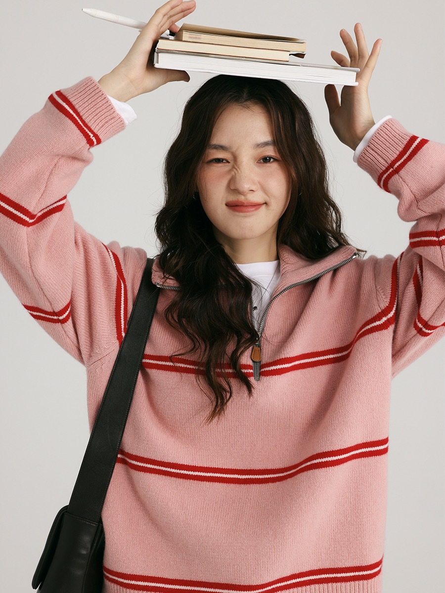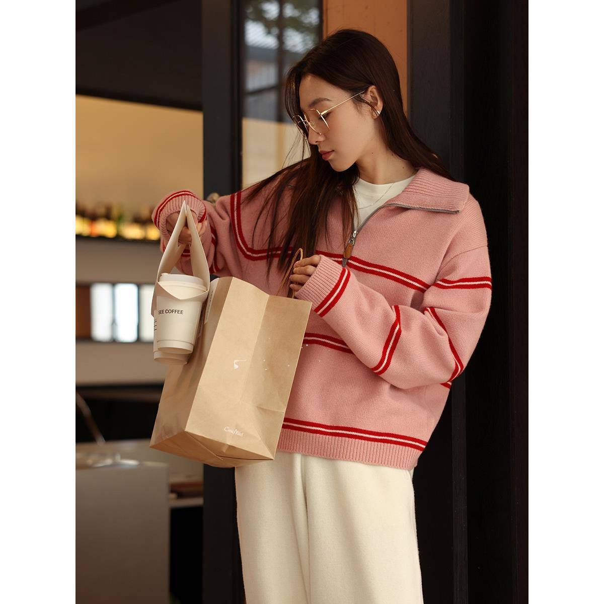 Главная страница > Xu Oldtimes корейский ретро контрастного цвета универсальный полосатый розовый свитер на молнии для женщин 2025 осень и зима новый стиль